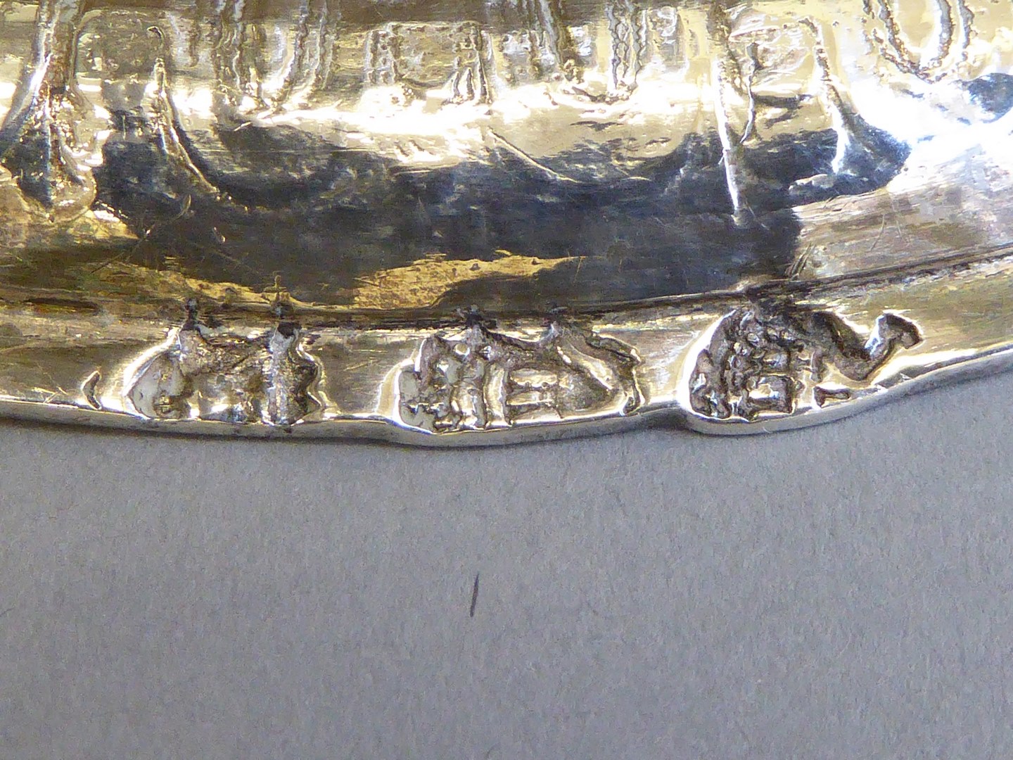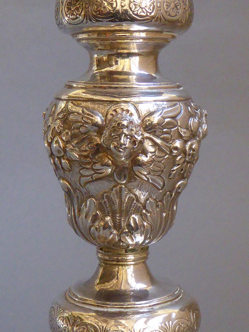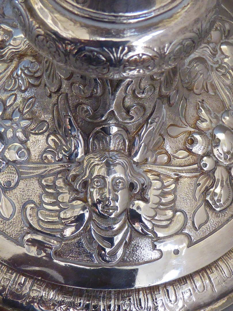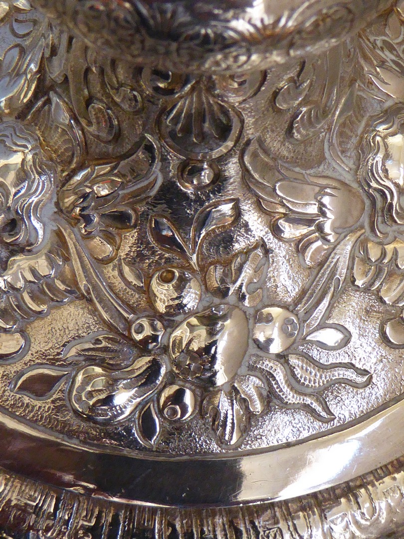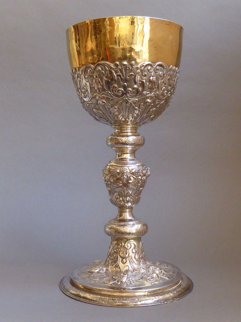 Kelk met gedreven motieven van acanthusbladeren en krullen, op stam en voet drie cherubijnen en fruittrossen in reliëf