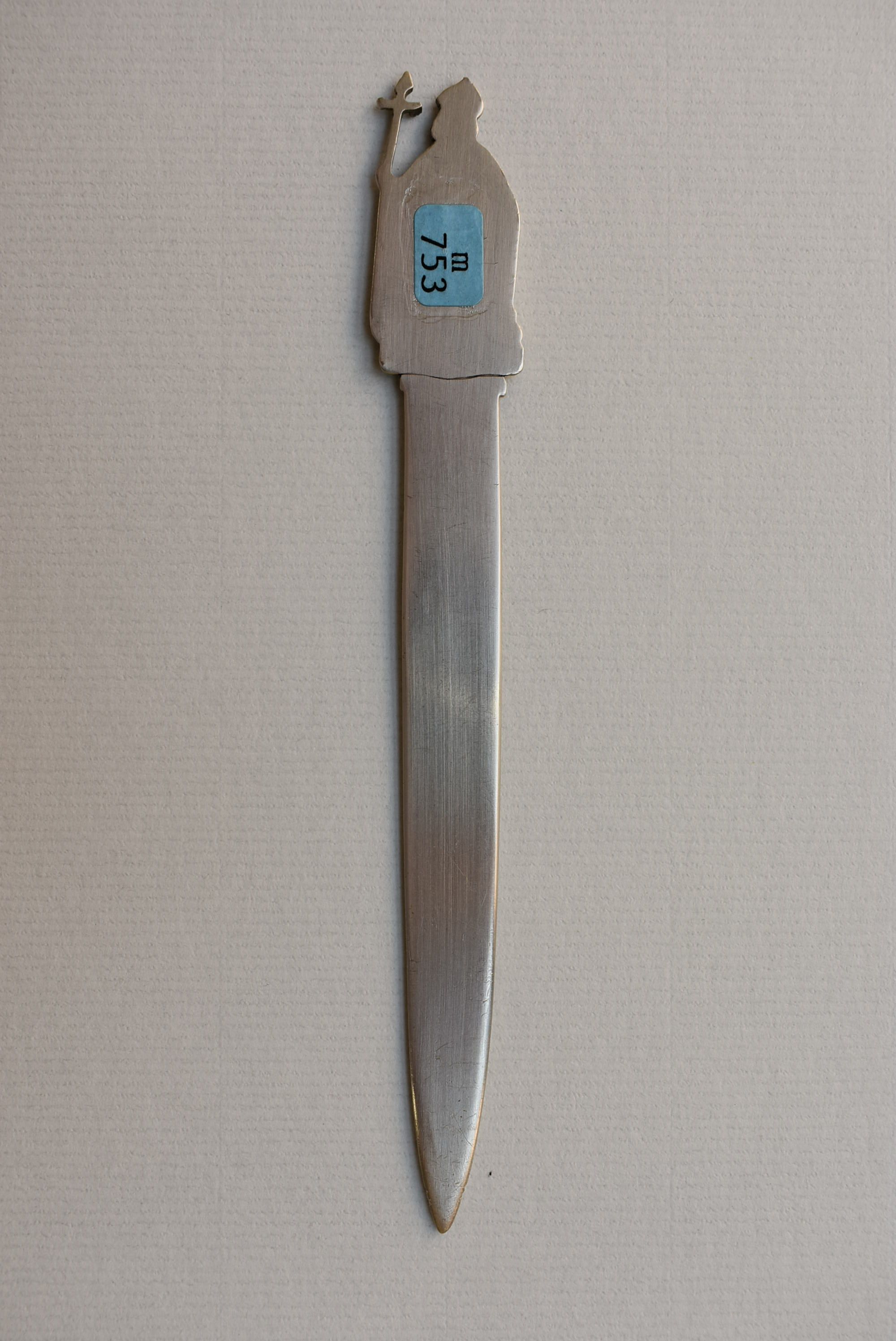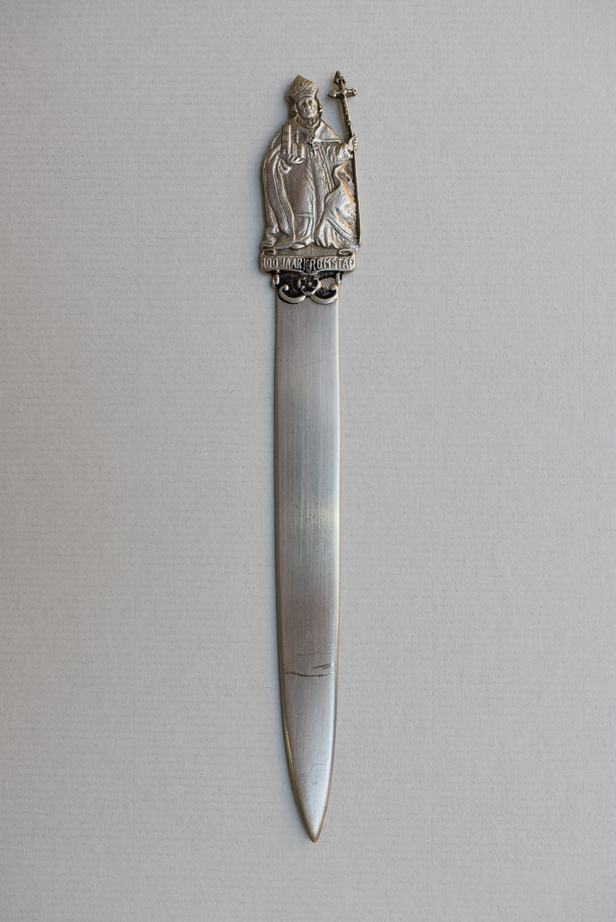 Briefopener met Willibrord en met "100 jaar kromstaf" t.g.v. het 100-jarig jubileum van het herstel van de bisschoppelijke hiërarchie in Nederland