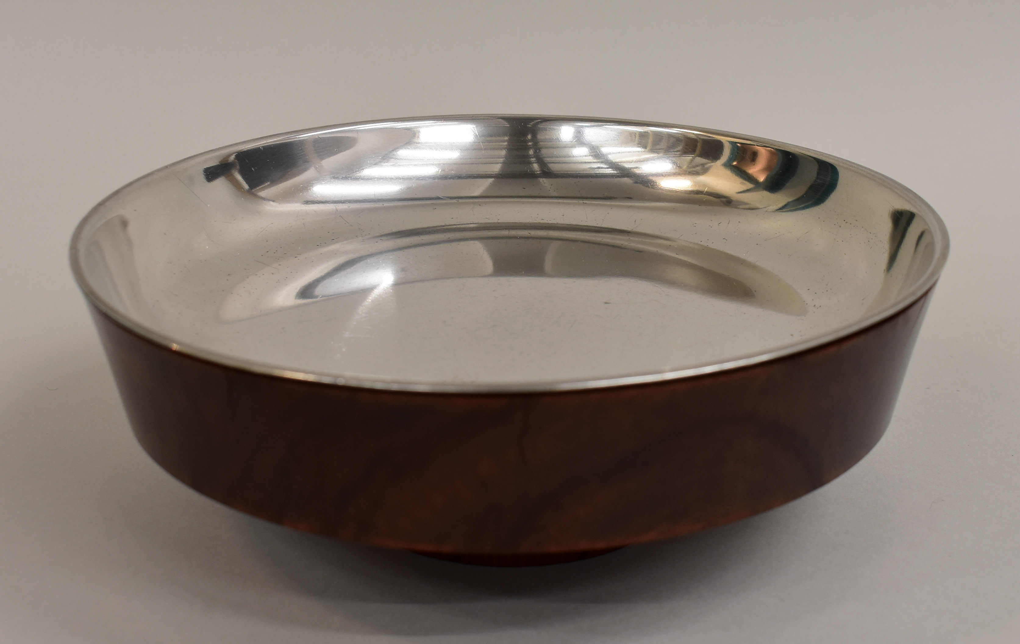 Zilveren hostieschaal op cilindrische voet bekleed met olijf- of resakhout