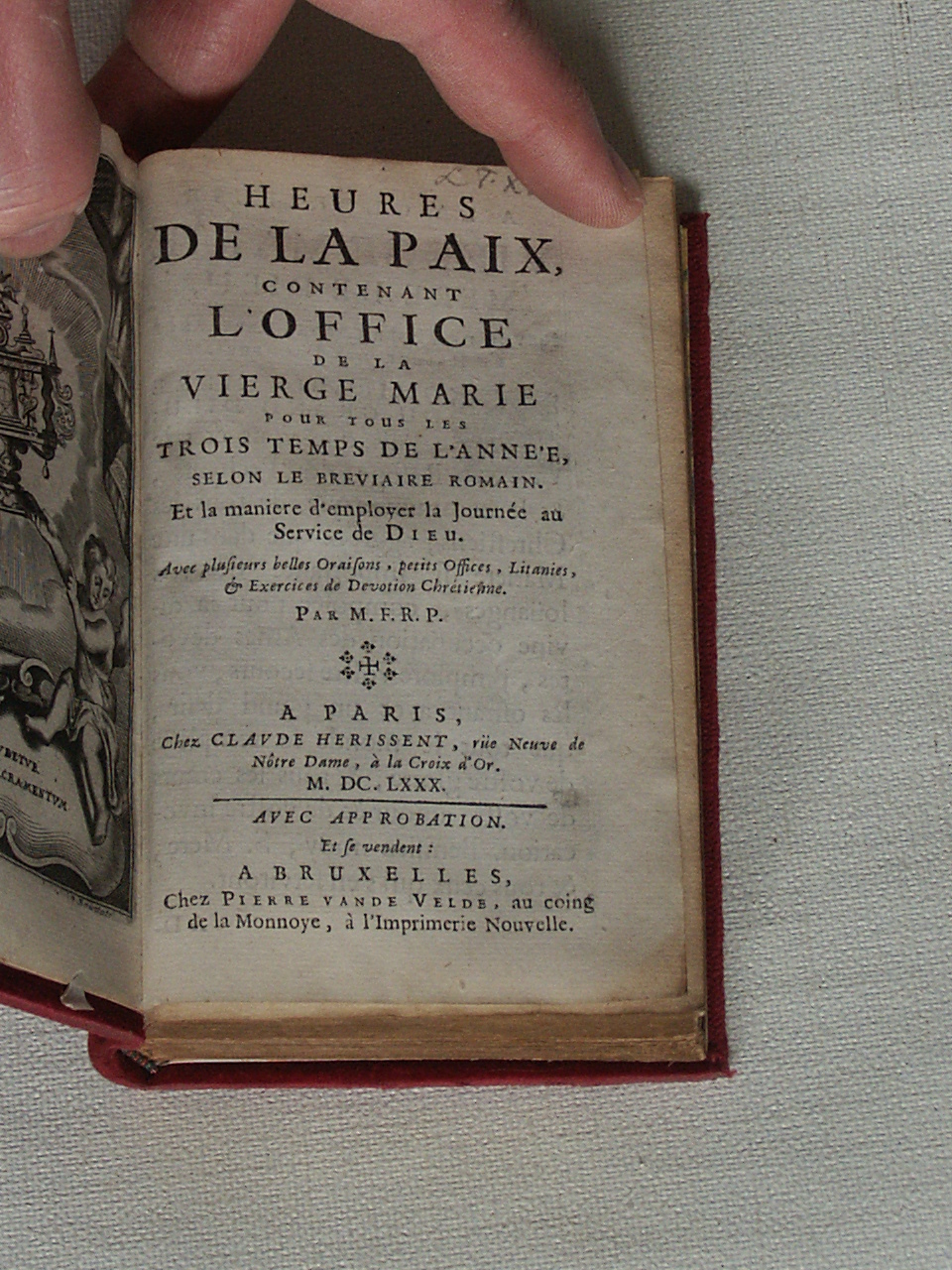 Heures de la paix : contenant l'office de la Vierge Marie pour tous les trois temps de l'anneé, selon le Breviaire romain : et la maniere d'employer la journée au service de Dieu : avec plusieurs belles oraisons, petits Offices, Litanies, & exercices de devotion chrétienne