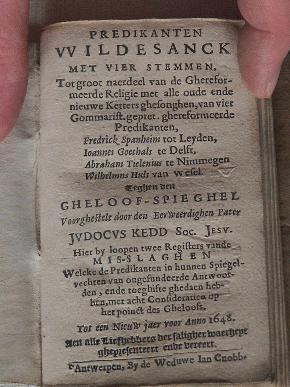 Predikanten wildesanck met vier stemmen. tot groot nadeel van de Ghereformeerde Religie met alle oude ende nieuwe ketters ghesongen, van vier Gommarist. gepret. ghereformeerde predikanten, Fredrick Spanheim, tot Leyden, Ioannes goethals te Delft, Abraham Tielenius te Nimmegen Wilhelmus Huls van Wesel. Teghen den gheloof-spieghel voorghestelt door den eerweerdighen pater Judocus Kedd Soc. Jesu. Hier by ...