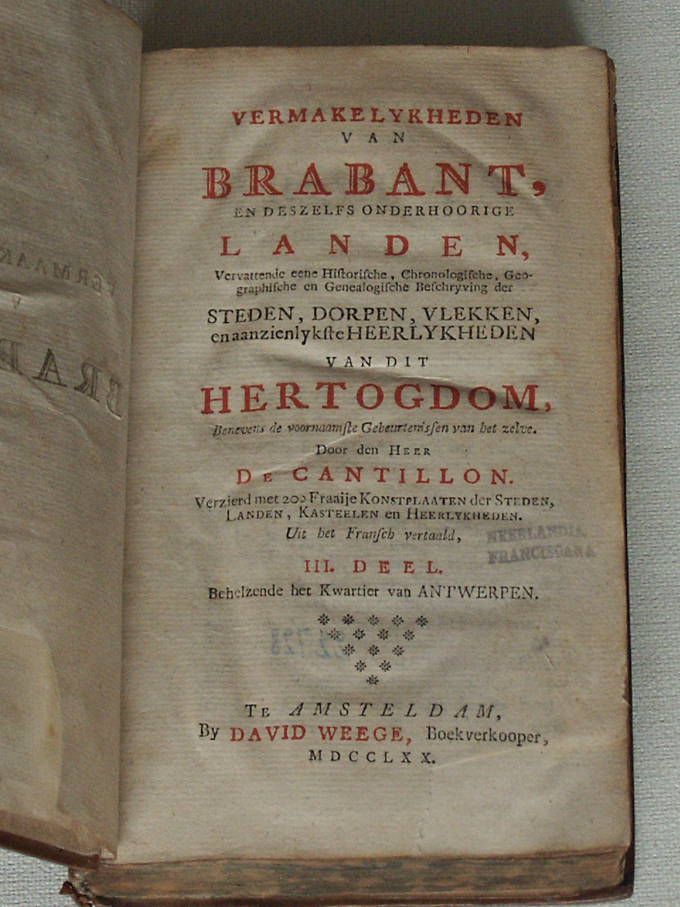 Vermakelykheden van Brabant, en deszelfs onderhoorige landen, vervattende eene historische, chronologische, geographische en genealogische beschryving der steden, dorpen, vlekken en aanzienlykste heerlykheden van dit hertogdom, benevens de voornaamste gebeurtenissen van het zelve [...] Deel III, Behelzende het kwartier van Antwerpen