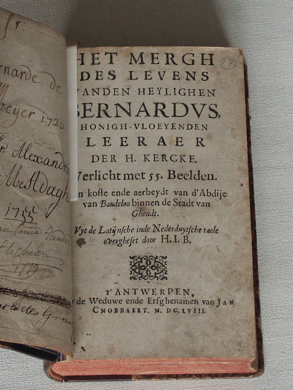 Het mergh des levens van den heylighen Bernardus, honigh-vloeyenden leeraer de h. kercke verlicht met 55 beelden ten koste ende aerbeydt van d'abdije van Baudeloo binnen de stadt van Ghendt