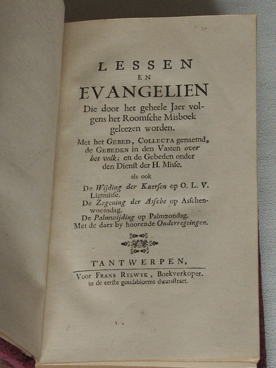 Lessen en evangelien die door het geheele jaer volgens het Roomsche misboek gelezen worden. Met het gebed, collecta genaemd, de gebeden in den vasten over het volk: en de gebeden onder den dienst der h. misse.