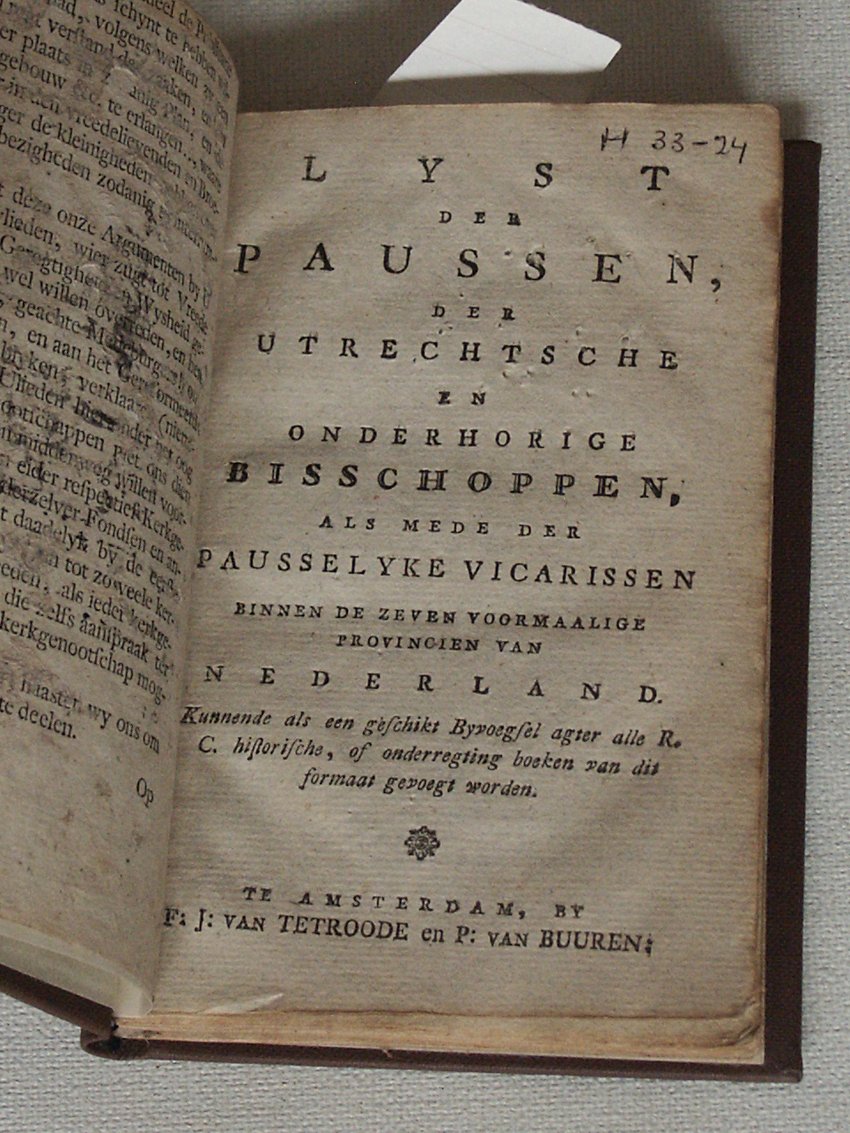 Lyst der paussen, der Utrechtsche en onderhorige bisschoppen, als mede der pausselyke vicarissen binnen de zeven voormaalige provincien van Nederland.