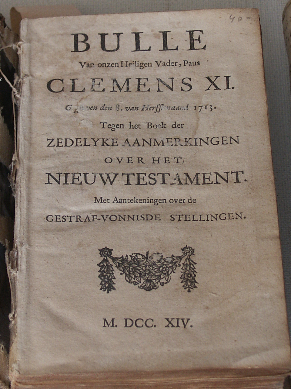 Bulle van onze heiligen vader, paus Clemens XI [...] Tegen het boek der zedelyke aanmerkingen over het Nieuw Testament. Met aantekeningen over de gestraf-vonnisde stellingen.