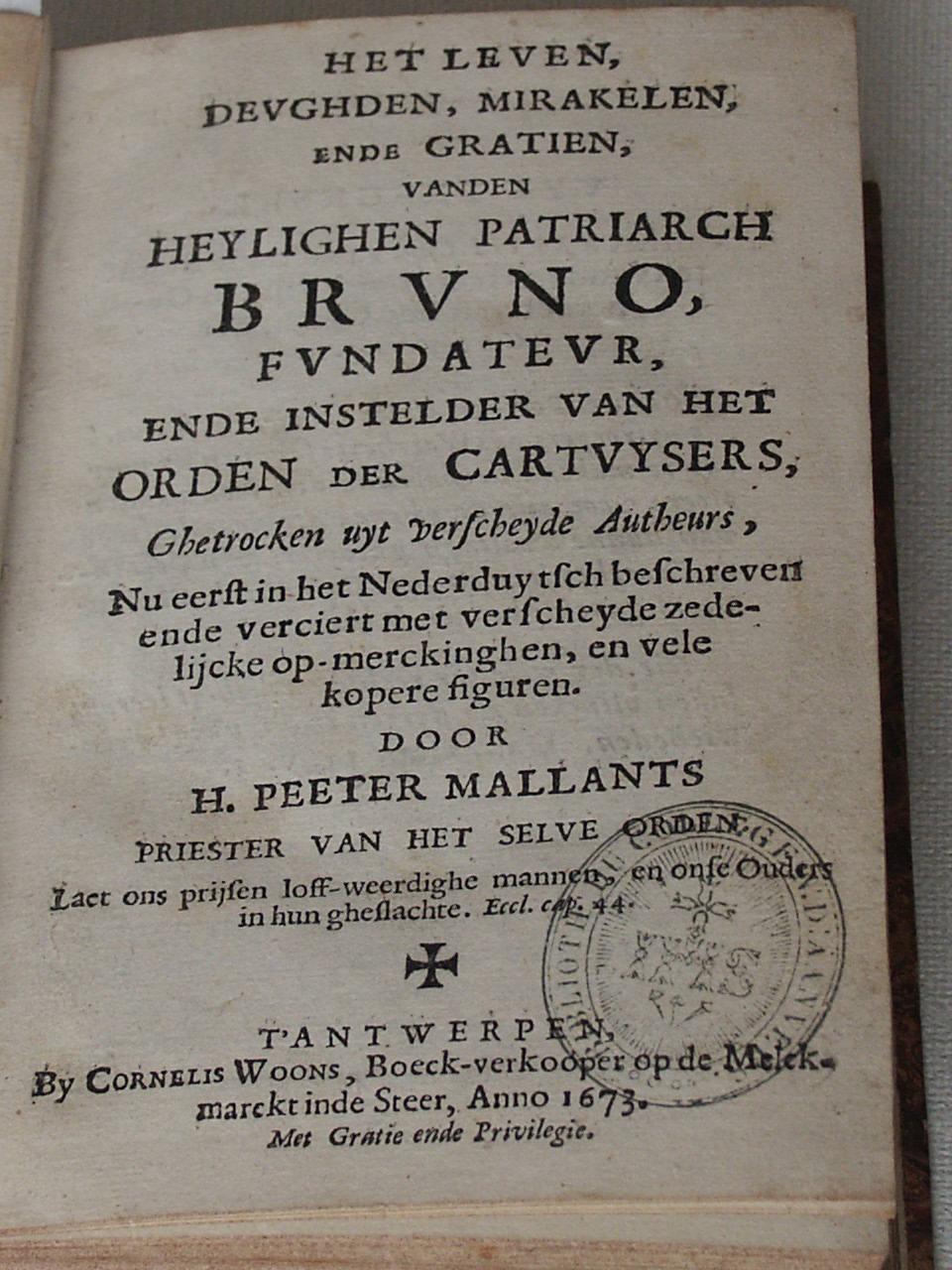Het leven, devghden, mirakelen, ende gratien, vanden heylighen patriarch Bruno, fundateur, ende instelder van het orden der Cartvysers. : ghetrocken uyt verscheyde autheurs, nu eerst in het Nederduytsch beschreven ende verciert met verscheydene zedelijcke op-merckinghen, en vele kopere figuren.