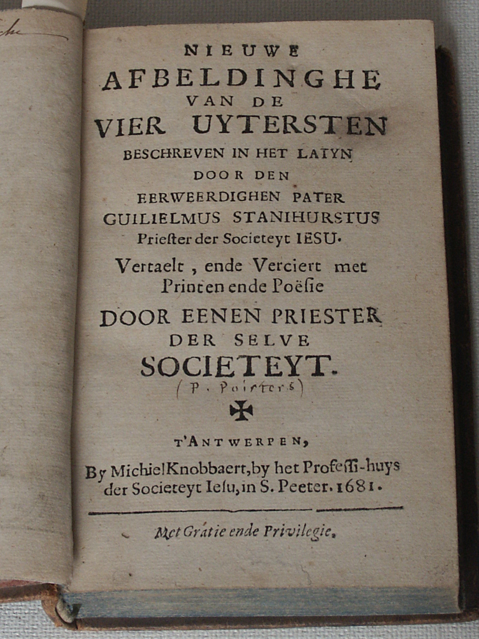 Nieuwe afbeldinghe van de vier uytersten door den eerweerdighen pater Guillielmus Stanihurtus priester der societeyt Jesu. Vertaelt verciert met printen en poesie door eenen priester der selve societeyt.