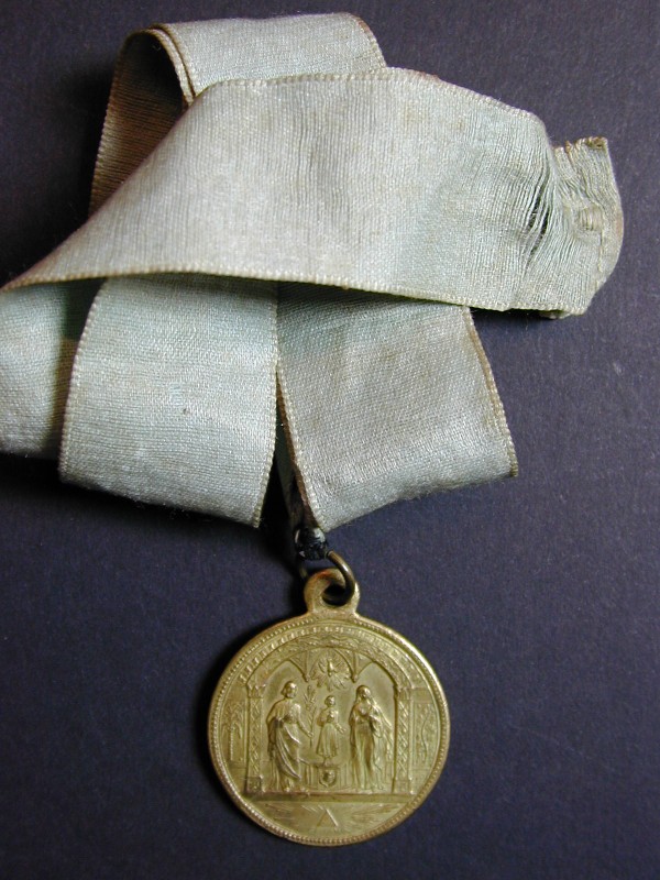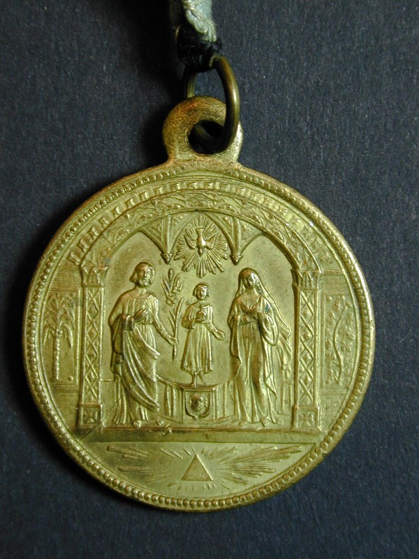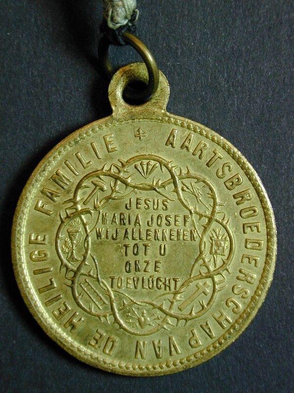 Penning Aartsbroederschap van H. Familie met H. Familie staande in bogengalerij, aan blauw lint