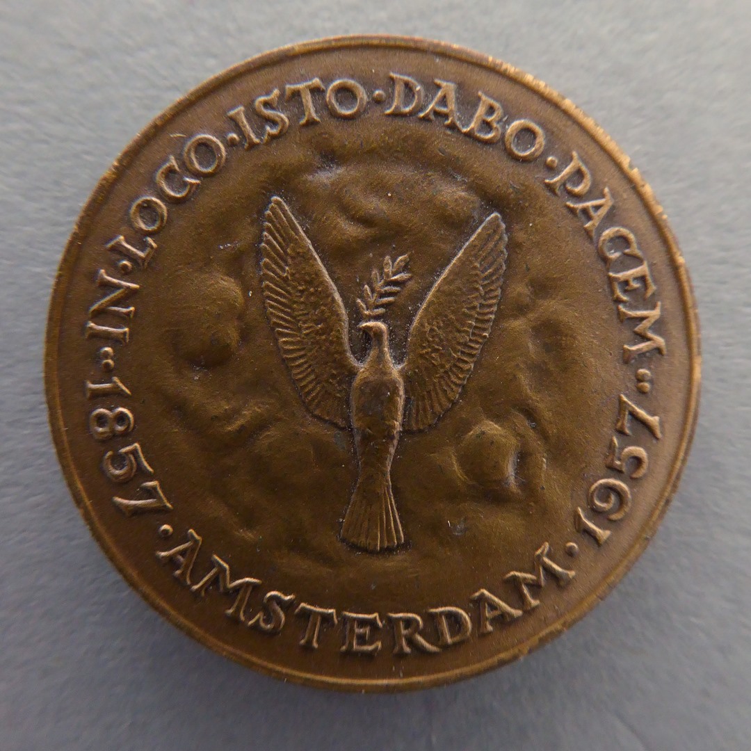 Gedenkpenning 100 jaar 'De Duif', "Sint Willebrordus Binnen de Veste Het Vrededuifje", met Willibrord, kz. duif met palmtak, "In loco isto dabo pacem 1857 Amsterdam 1957"