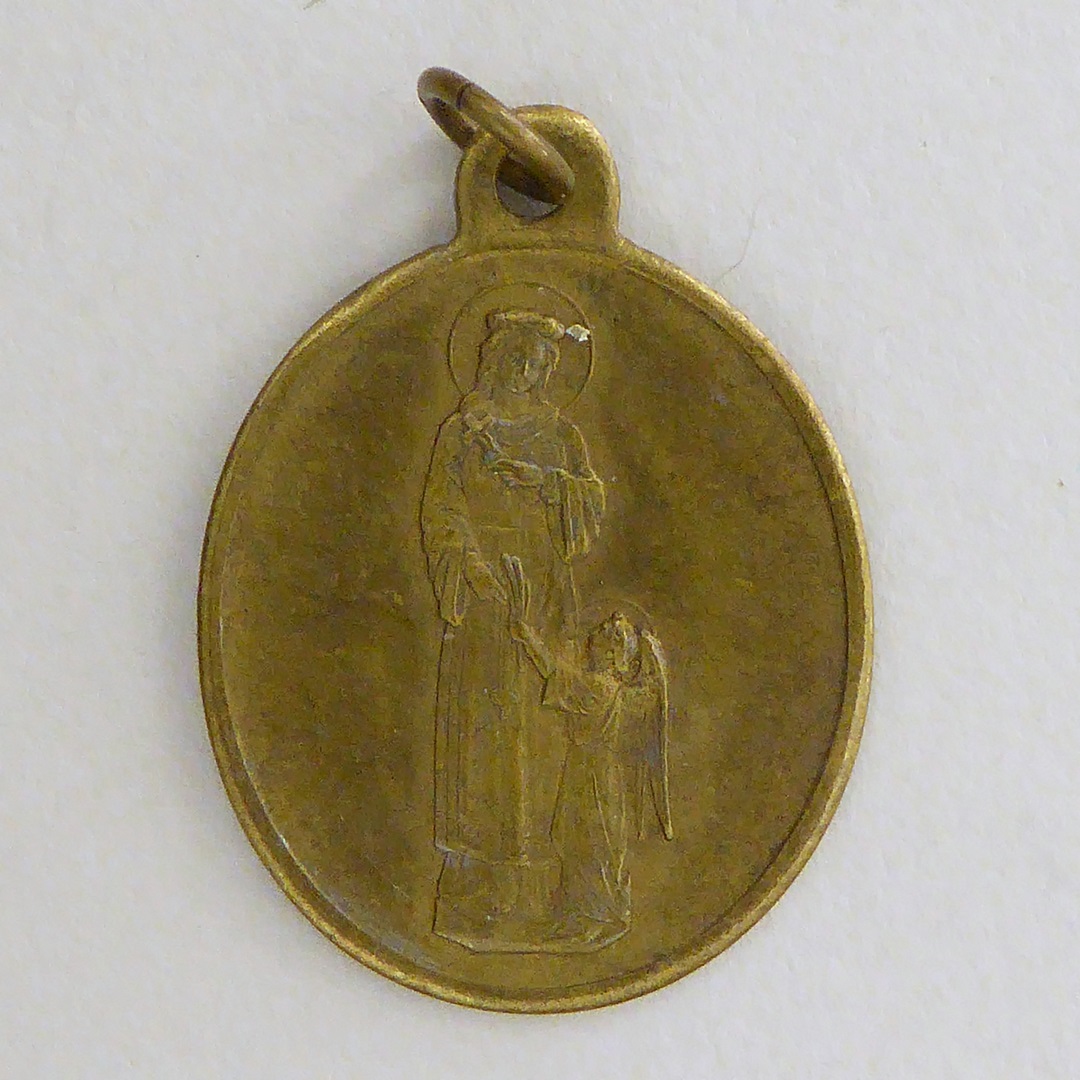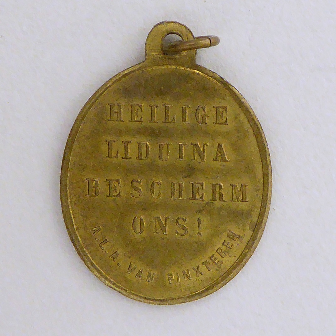 Devotiepenning, ovaal, met H. Lidwina van Schiedam en engel, kz. tekst
