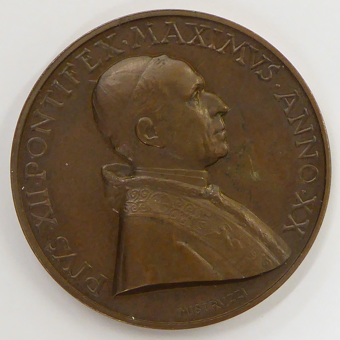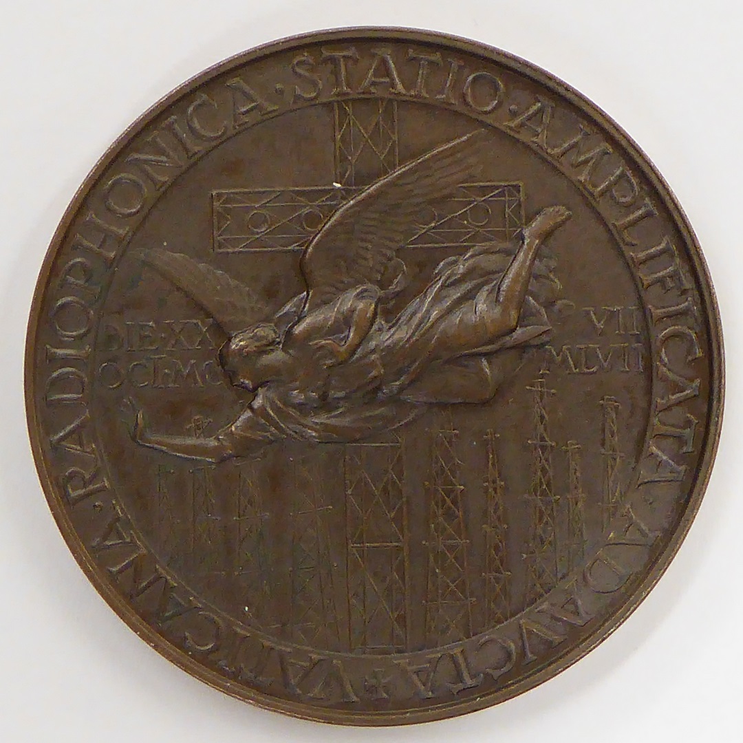 Pauspenning met portret paus Pius XII (1939-1958), kz. zendmasten radio Vaticana en engel