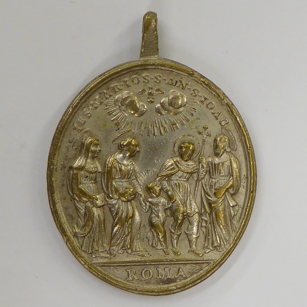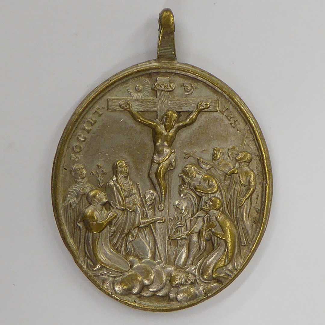 Draagpenning Jezuïetenorde met kruisiging en heiligen, kz. Jezus, Maria, Jozef, Anna, Joachim