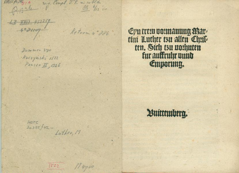 Eyn trew vormanung Martini Luther tzu allen Christen. Sich tzu vorhuten fur auffruhr vnnd Emporung