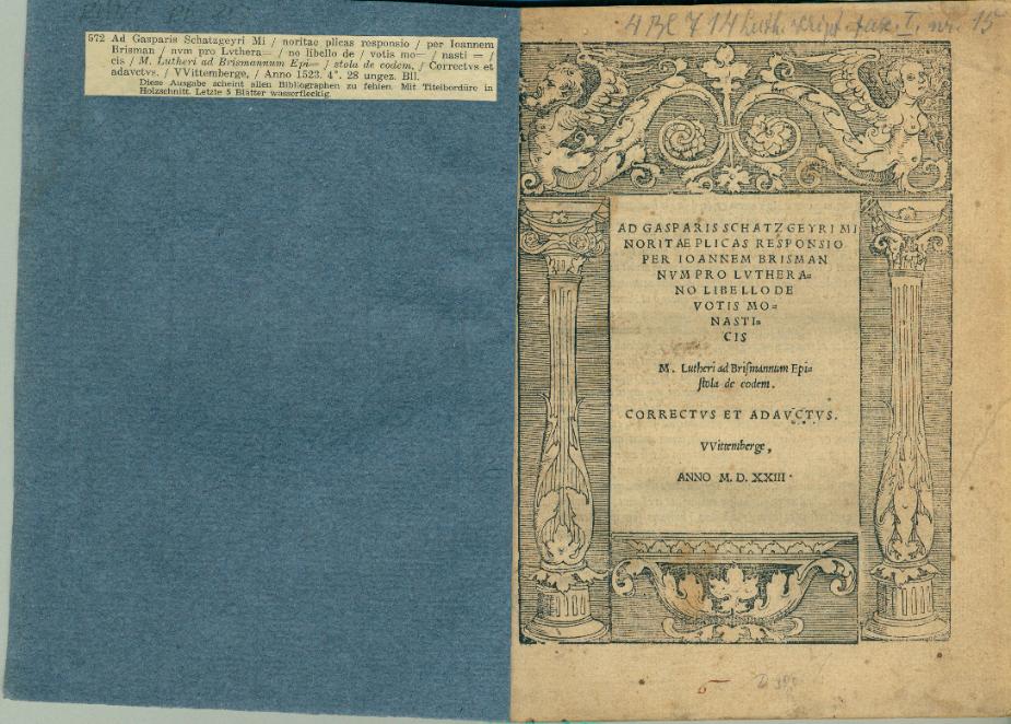 Ad Gasparis Schatzgeyri Minoritae plicas Responsio per Joannem Brismannum pro Lutherano libello de votis monasticis