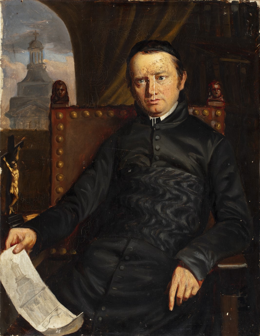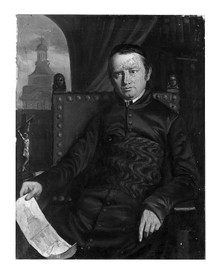 Portret van Joannes Toorenent (1806-1858), pastoor te Middelburg. In zijn rechterhand een bouwtekening van de Pieterskerk te Middelburg. Dezelfde kerk is zichtbaar door het raam links.