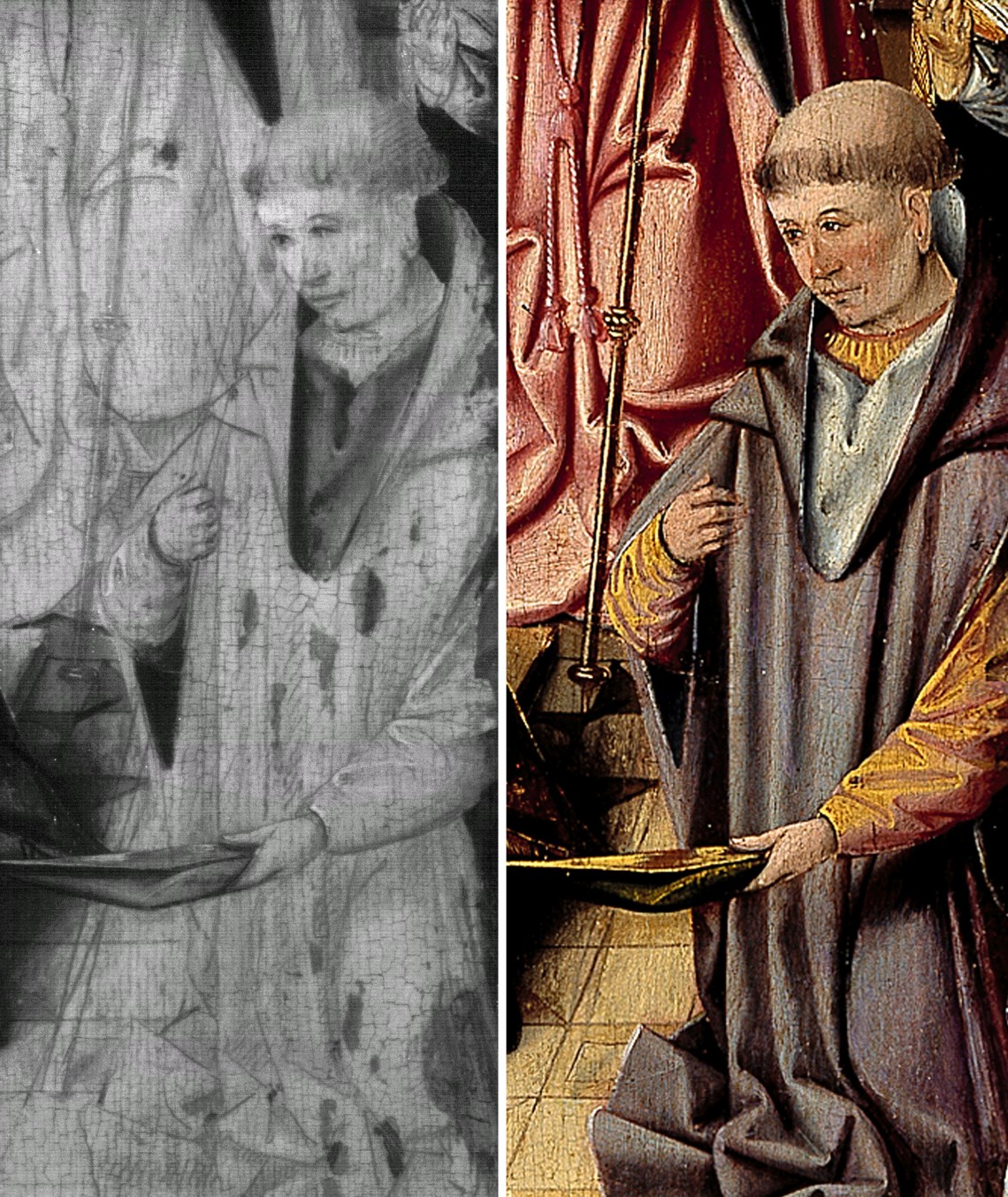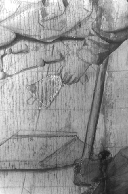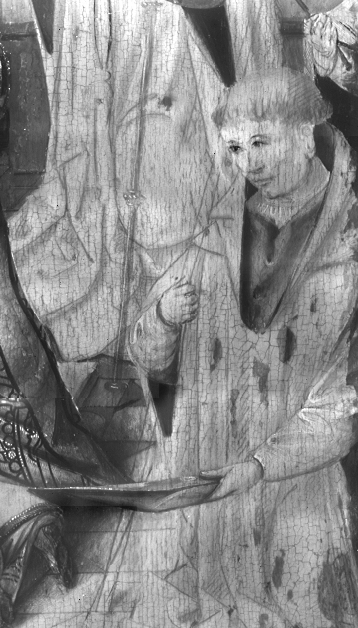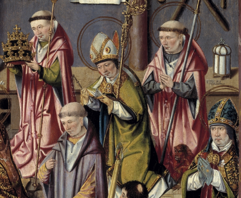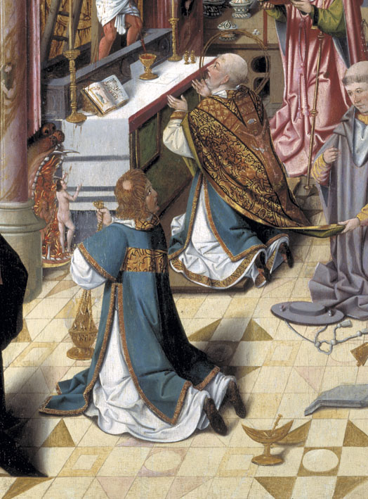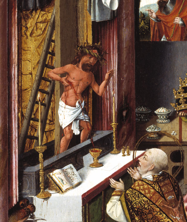 Paus Gregorius knielt voor het altaar. Christus staat in een sarcofaag achter het altaar. Het bloed uit zijn zijdewond stroomt in de kelk op de altaartafel en besprenkelt ook het naaktfiguurtje in het vagevuur naast het altaar. Tegen de achterwand en op de tafel zijn passiewerktuigen afgebeeld en figuren die bij Christus’ lijden betrokken waren. ...