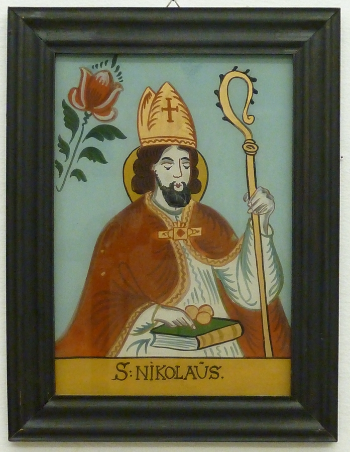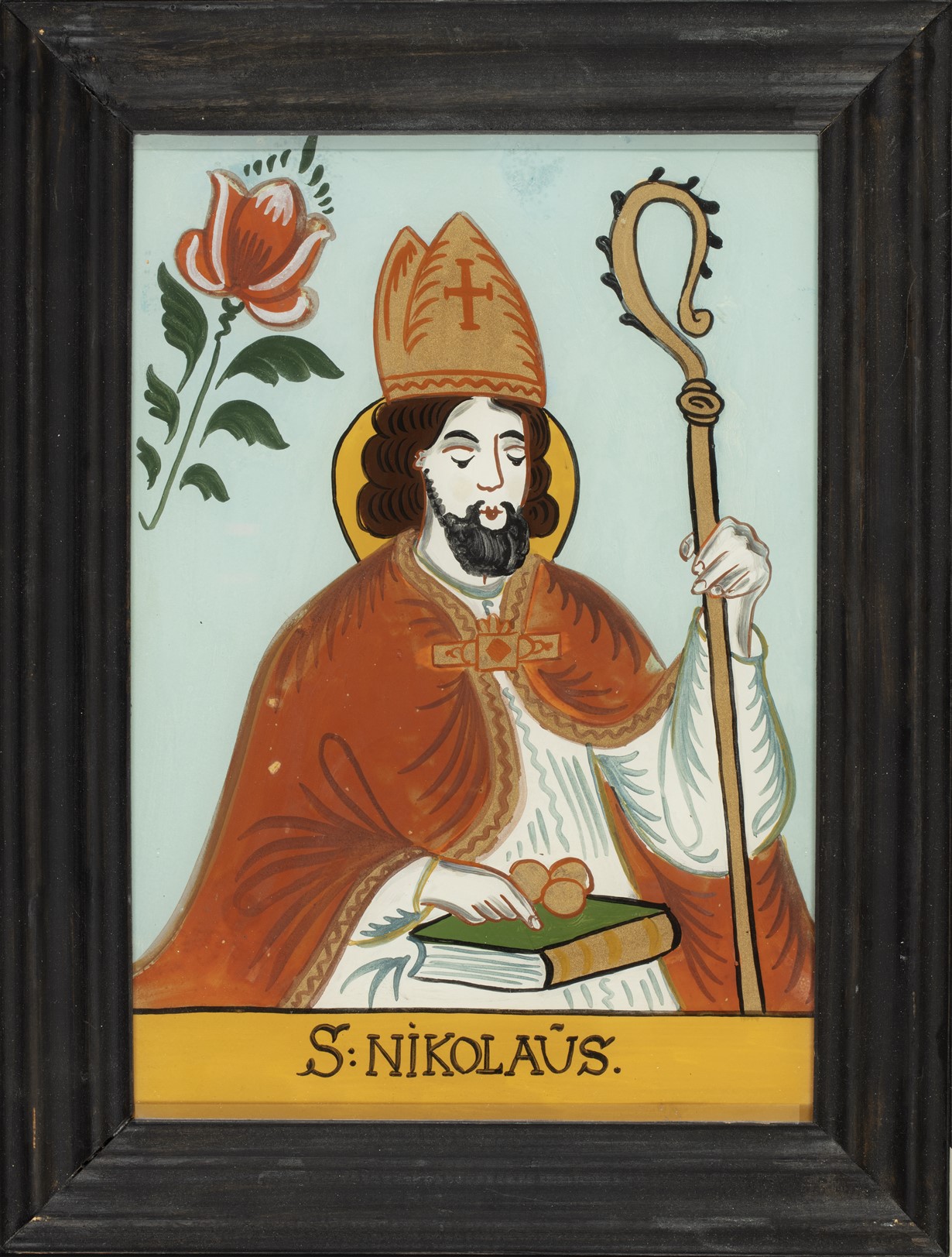 Achterglasschildering van Sint Nicolaas met staf en boek met drie bollen en met "S:Nikolaus."