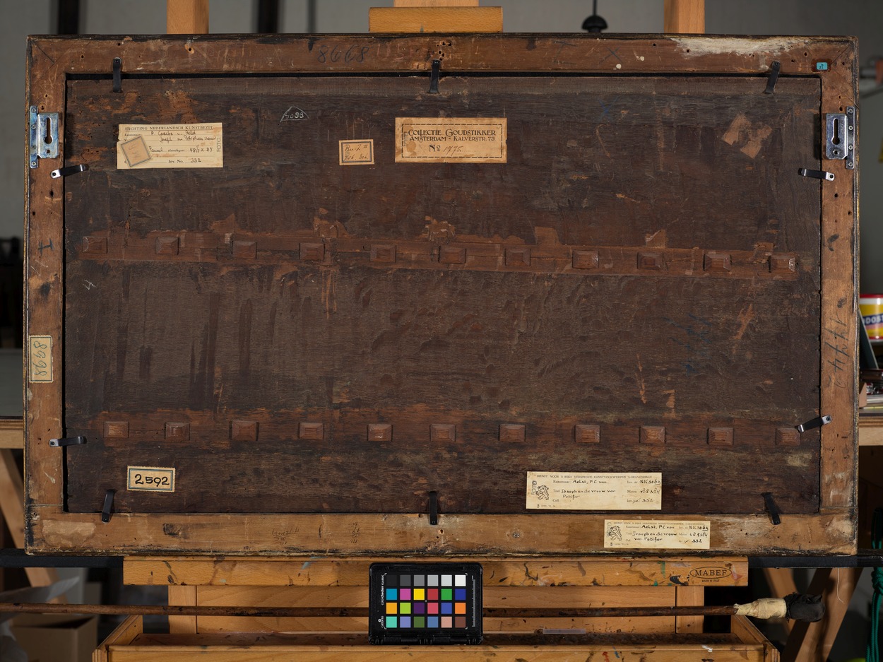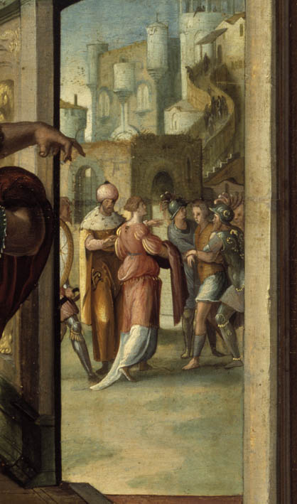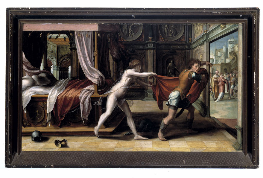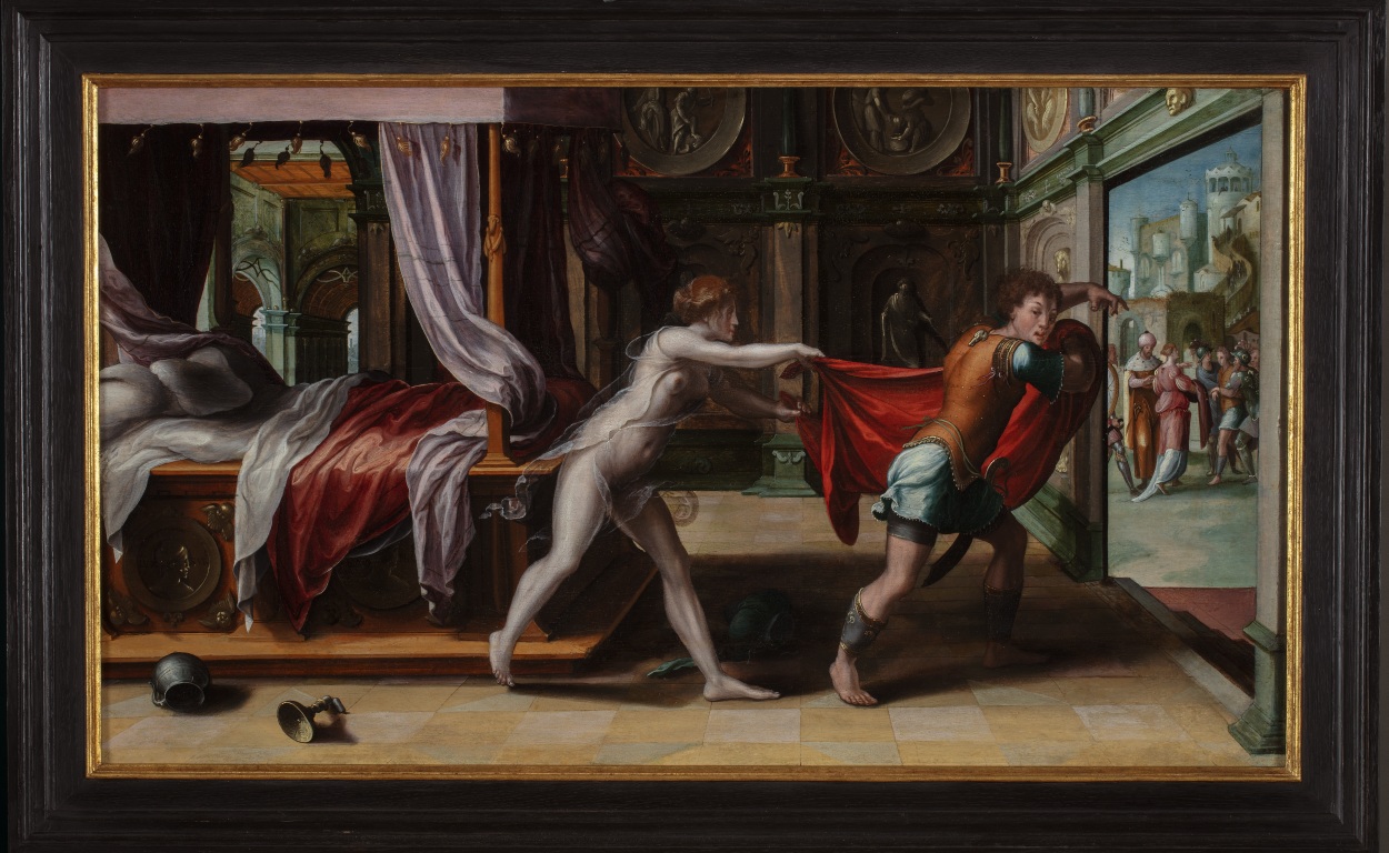 In een renaissance-vertrek met een hemelbed slaat Jozef op de vlucht voor de vrouw van Potifar die hem tracht tegen te houden door zijn mantel vast te grijpen. Voor het bed liggen een kruik en een kandelaar. De portretmedaillons op het bed dragen de teksten: 'LVX' 'SVR' en 'SAPI' 'ENCE'. Op de medaillons aan de ...