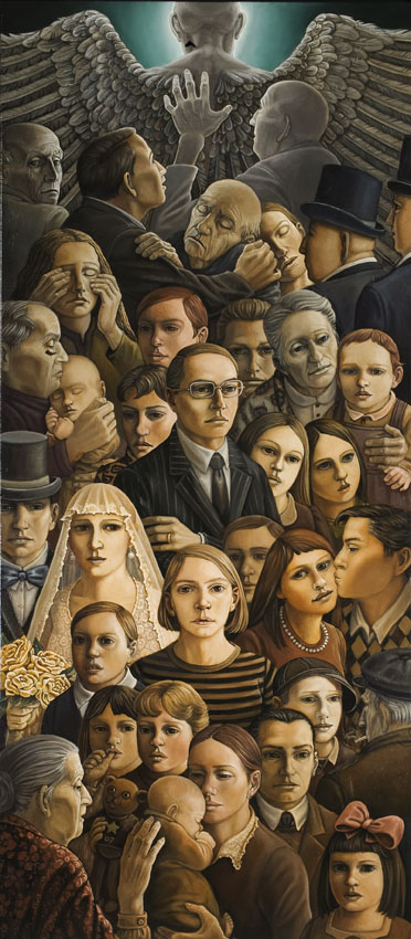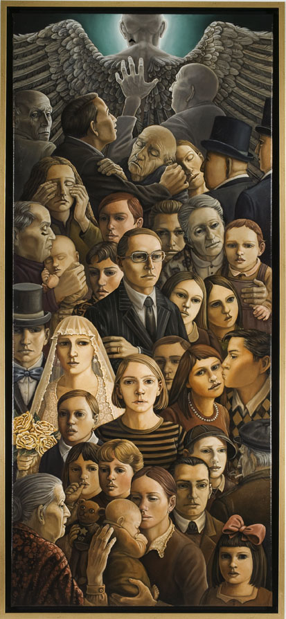 De levensgang van de mens is op dit schilderij afgebeeld; van onder naar boven zien we de verschillende stadia van het menselijk leven. In aard(s)e tinten geschilderd is het onderste deel waar een kind in de armen van zijn moeder rust en een oma de baby liefdevol koestert. Het jongetje wordt groter: een kind, een ...