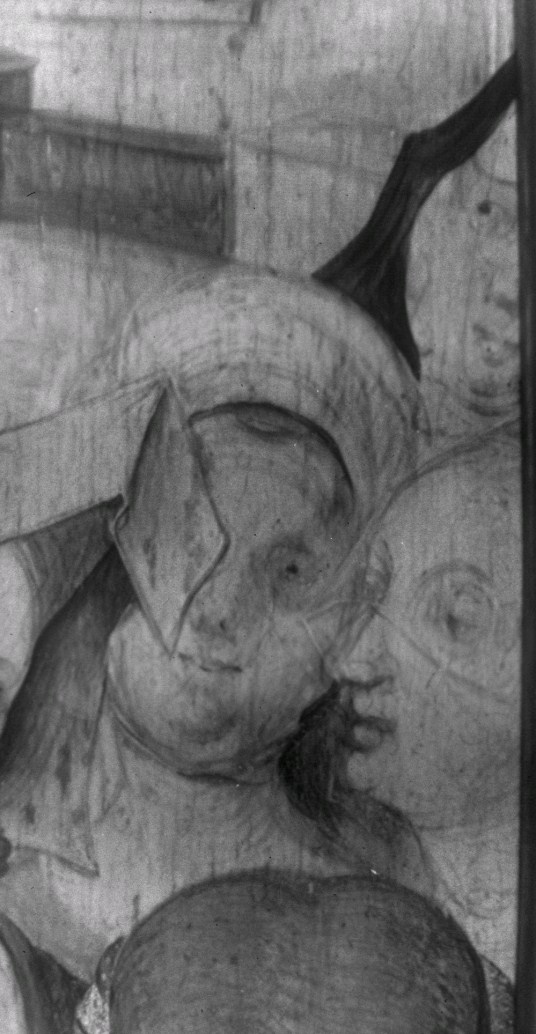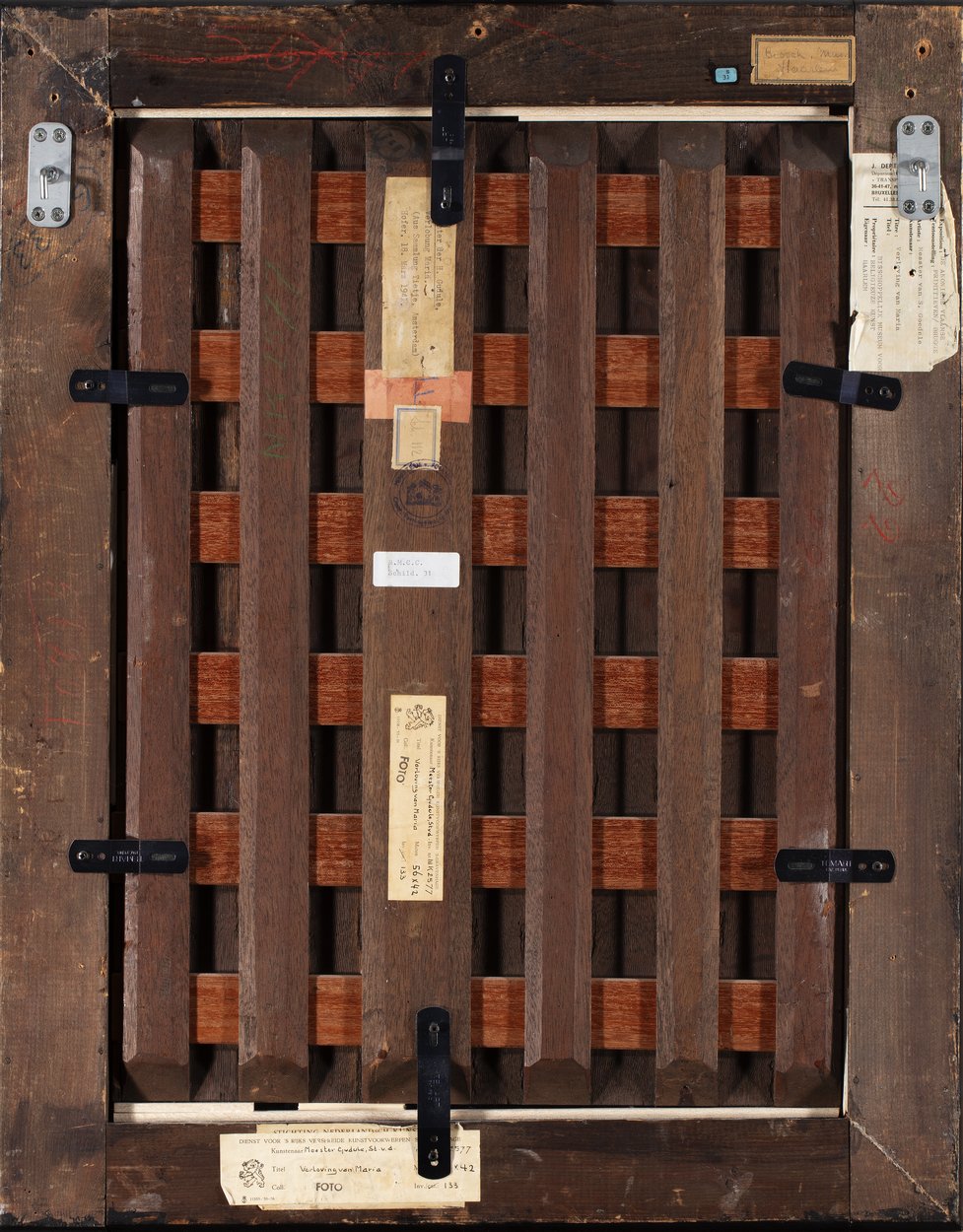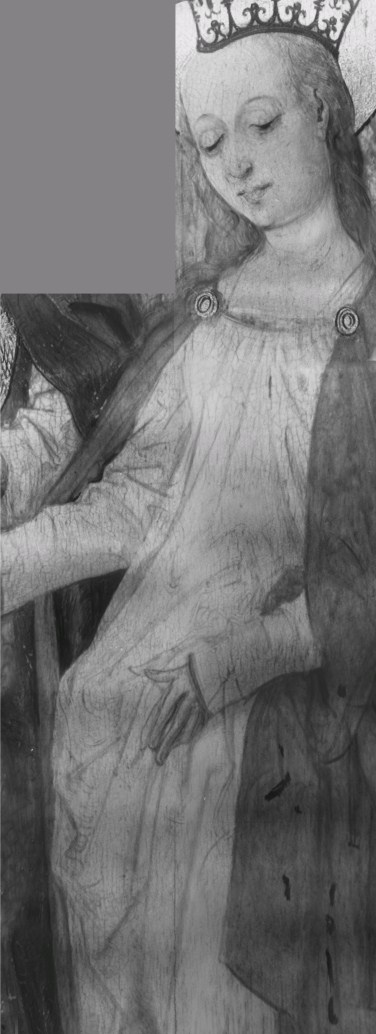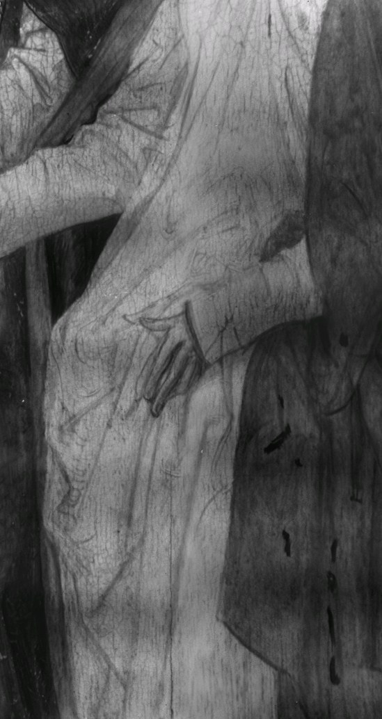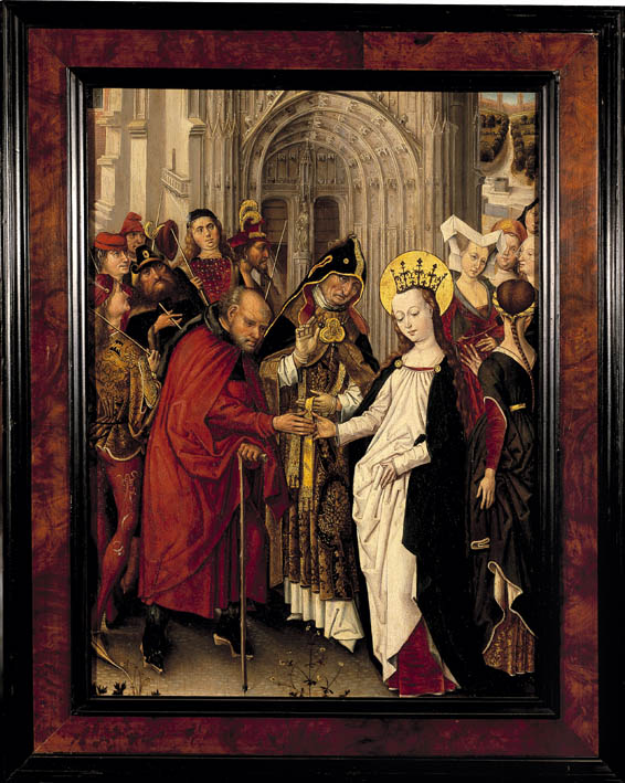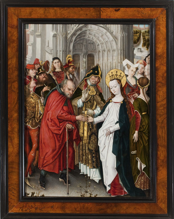De ceremonie speelt zich af voor het zuidportaal van de Onze-Lieve-Vrouw-op-de-Zavelkerk te Brussel. Jozef en Maria staan aan weerszijden van de priester en houden hun rechter hand tegen diens stola. Achter Jozef staan de afgewezen huwelijkskandidaten met in hun handen de niet tot bloei gekomen stokken. Achter Maria staan enkele vrouwen. Alle figuren dragen contemporaine ...