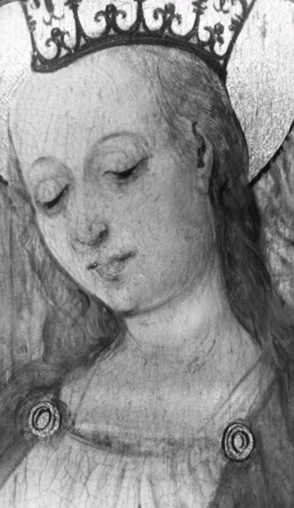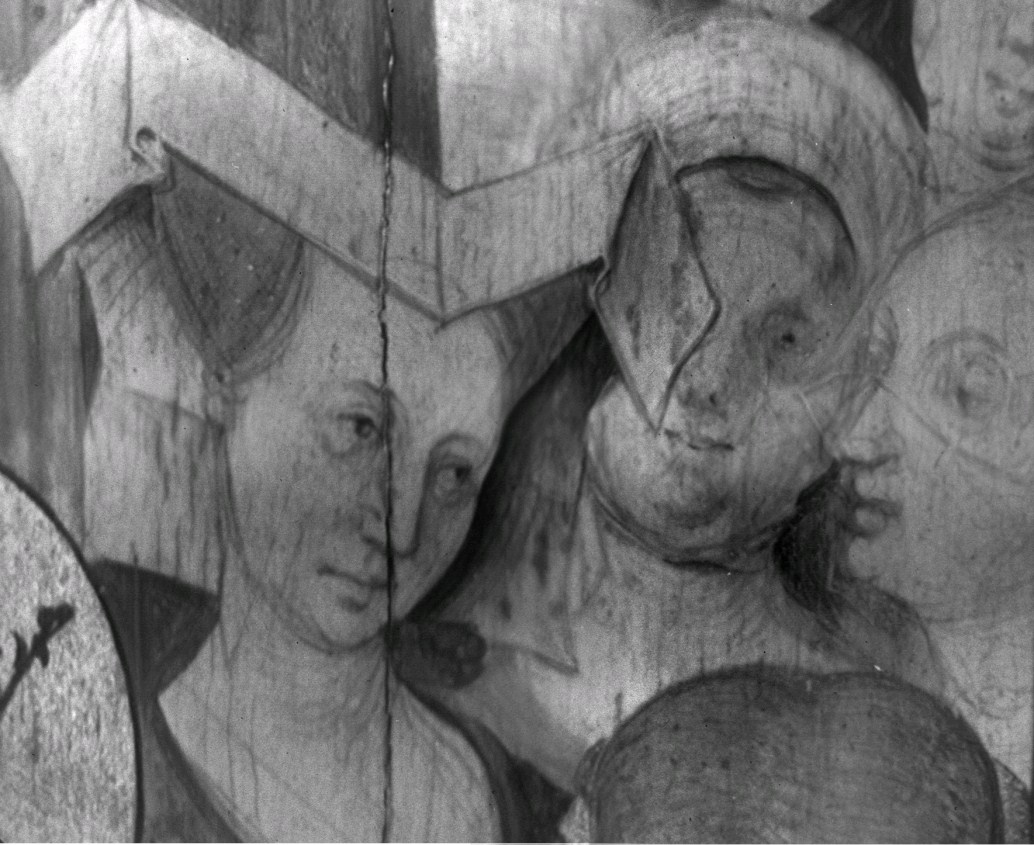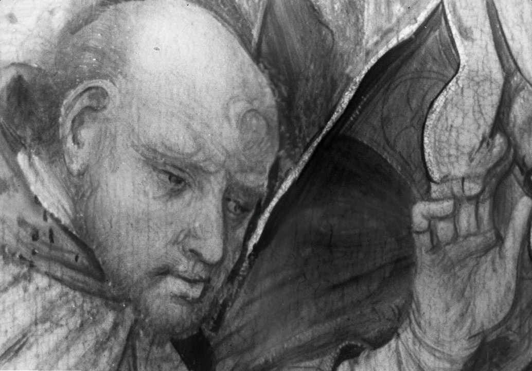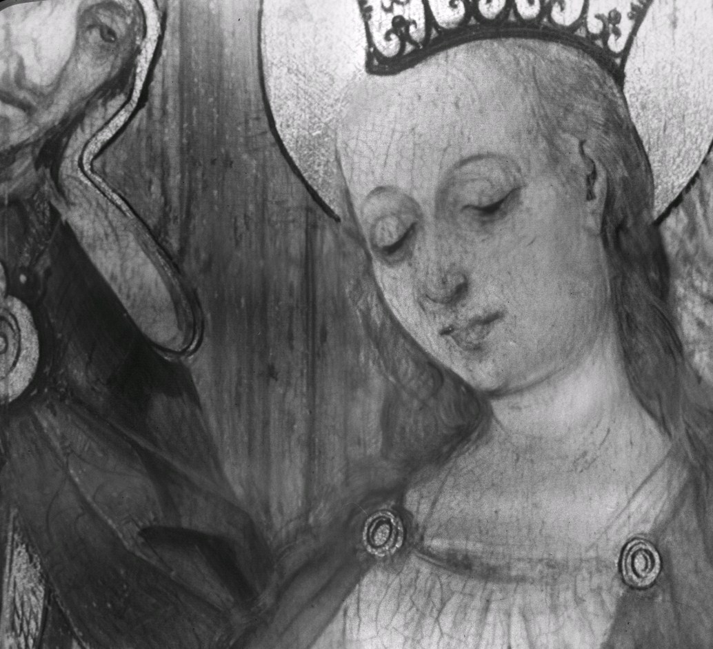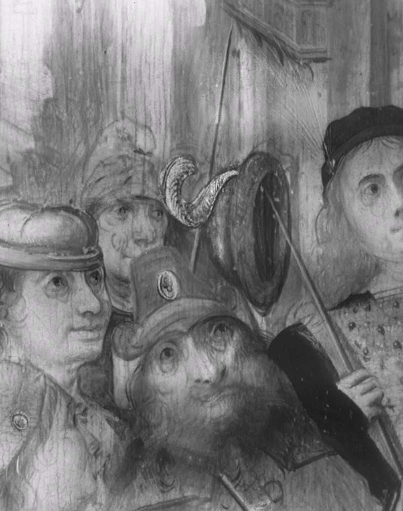 De ceremonie speelt zich af voor het zuidportaal van de Onze-Lieve-Vrouw-op-de-Zavelkerk te Brussel. Jozef en Maria staan aan weerszijden van de priester en houden hun rechter hand tegen diens stola. Achter Jozef staan de afgewezen huwelijkskandidaten met in hun handen de niet tot bloei gekomen stokken. Achter Maria staan enkele vrouwen. Alle figuren dragen contemporaine ...