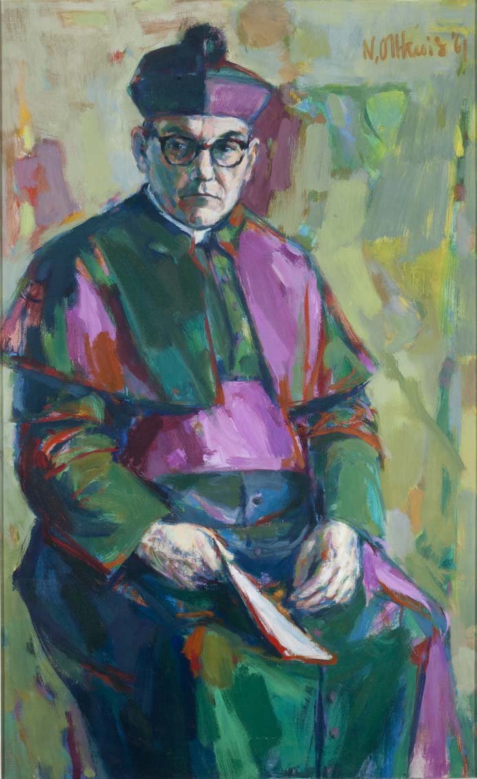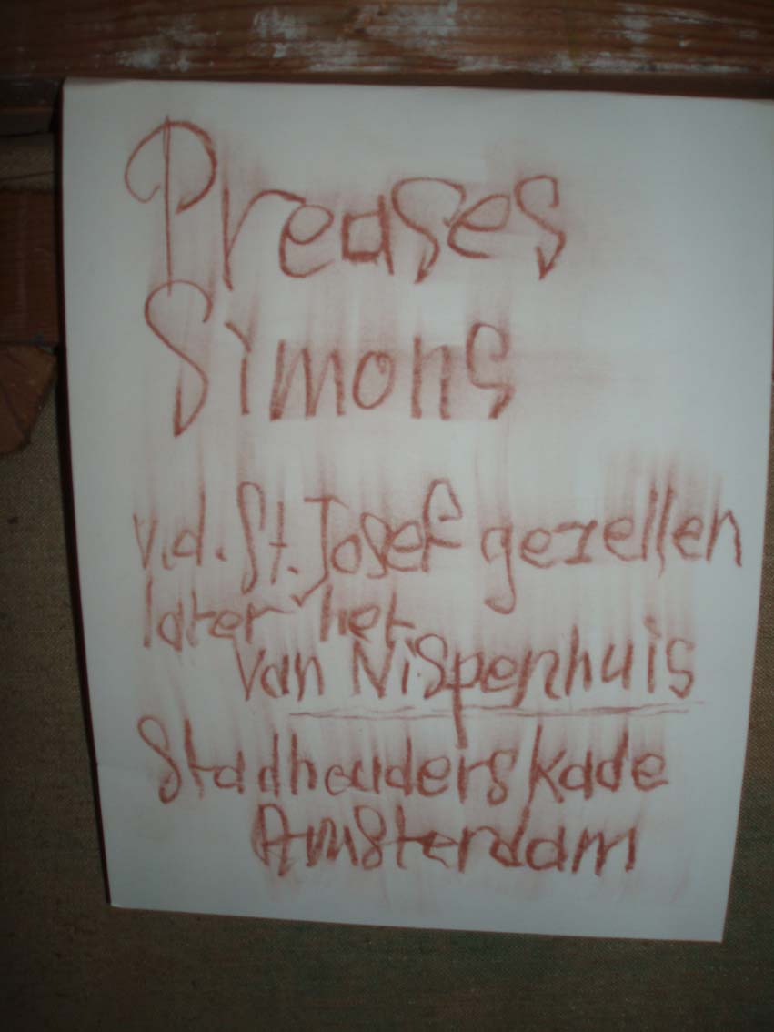 Portret van W.H. Simons, praeses van de Amsterdamse Sint Josef Gezellenvereniging. Op achterzijde middenboven gesigneerd en gedateerd: Norbert Olthuis 1961. Op achterzijde linksboven: Praeses Simons. Achterop de lijst linksonder is een etiket met de tekst: "Eigendom van de kunstschilder die dit werk gemaakt heeft: Norbert Olthuis Lauriergracht 6 Amsterdam - tel 220090 WH Simons praeses".