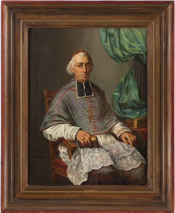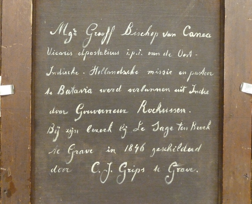 Portret van mgr. Jacobus Grooff (1800-1852), zittend voorgesteld in bisschoppelijk ornaat met rochet en borstkruis, in zijn linkerhand een boek. Op de achterzijde het opschrift 'Mgr. Grooff Bischop van Canea / Vicaris Apostolicus i.p.i. van de Oost- / Indische - Hollandsche missie en priester / te Batavia werd verbannen uit Indie / door Gouverneur Rochussen. ...