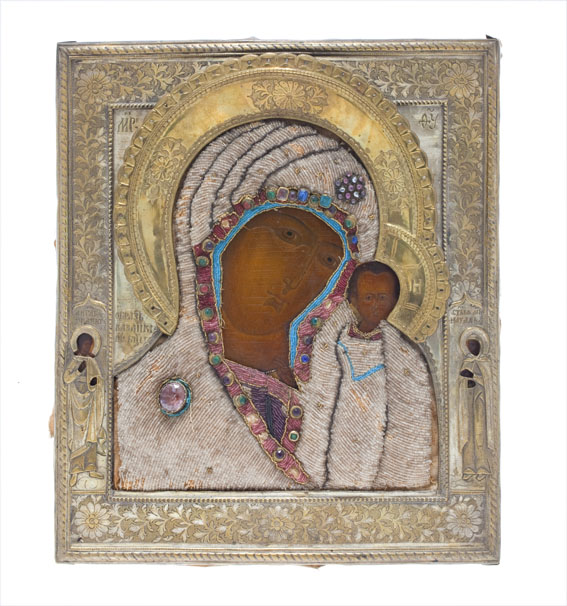 Moeder Gods Kazanskaja, met koperen oklad en textiel met gekleurde glasstenen