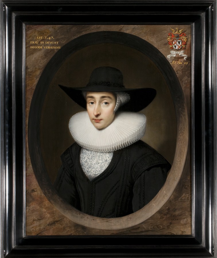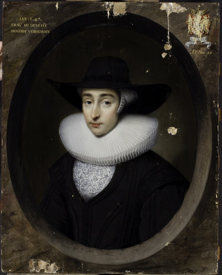 Gesigneerd en gedateerd rechtsonder: C.J. fecit / 1634. Een inscriptie rechtsboven: LVC.1.47. / FRAY IN DEVCHT / IN GODT VERHEVCHT., met haar familiewapen en een inscriptie linksboven: MARIA DIE FRAEYE 1634 / Æt Suæ.29.