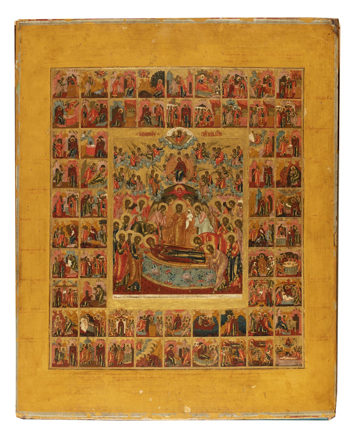 Leven van de Moeder Gods met centraal de Dormitio omringd door 60 scènes uit het leven van de Moeder Gods