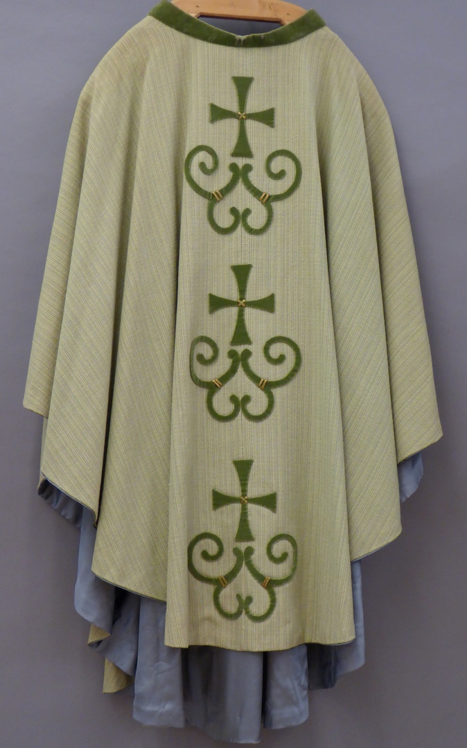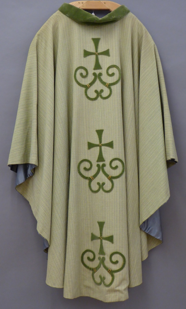 Groen kazuifel, halfcirkelvormig, met geappliceerde gestileerde ornamenten met kruis