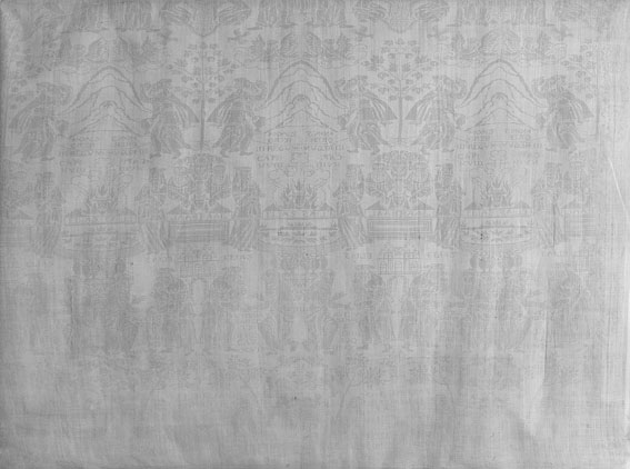 Gesteven tafellaken met vijf scènes uit de geschiedenis van Elia, gebruikt als avondmaalskleed