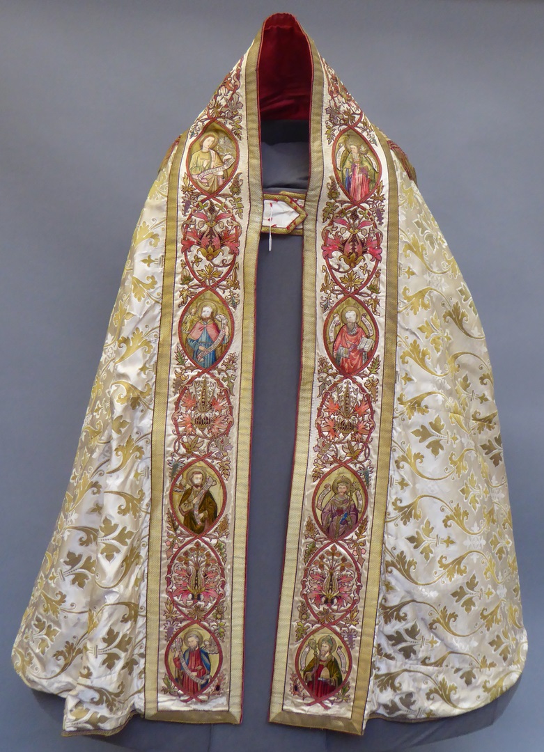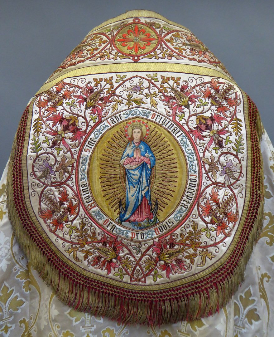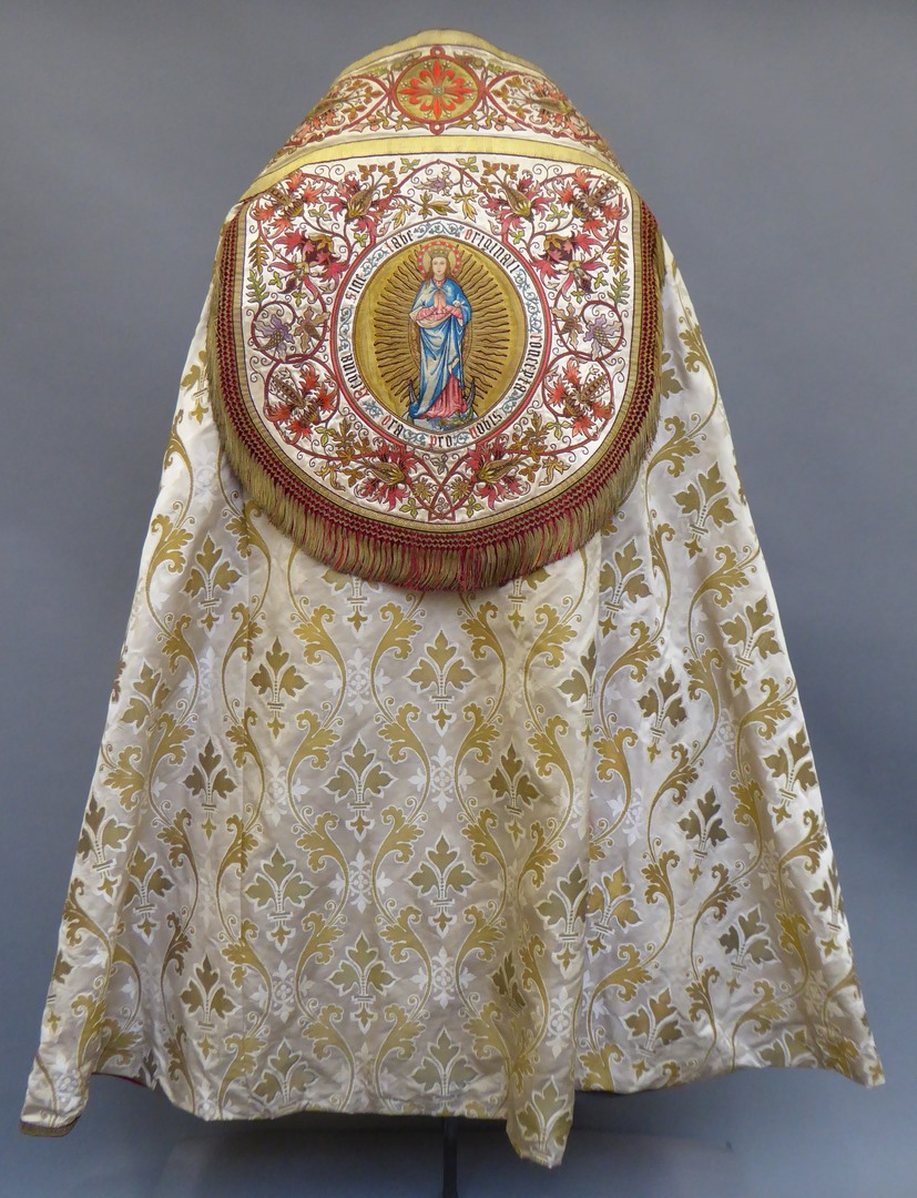 Witte koorkap met ingeweven gouden acanthusbladeren en lelies, schild met Maria op de maansikkel