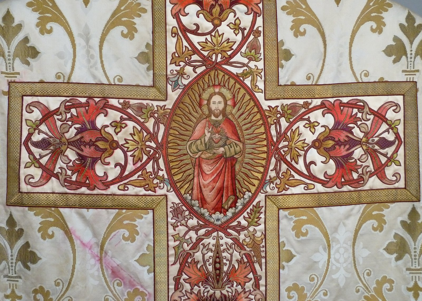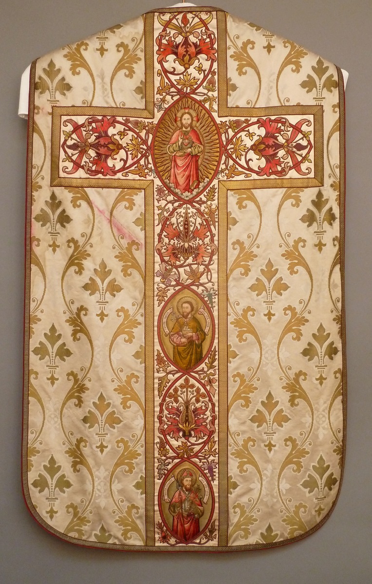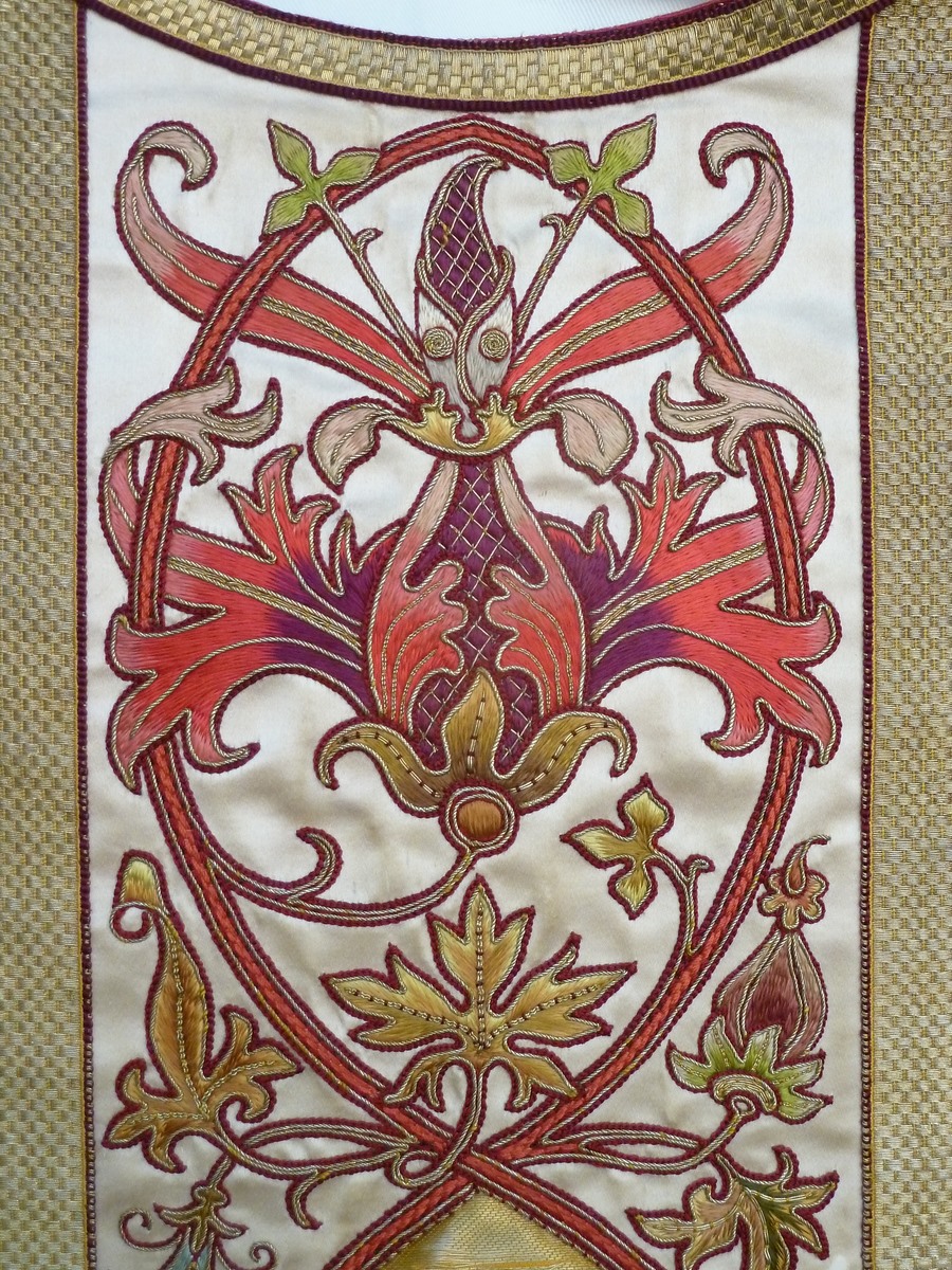 Wit kazuifel met ingeweven gouden acanthusbladeren en lelies, Christus in mandorla