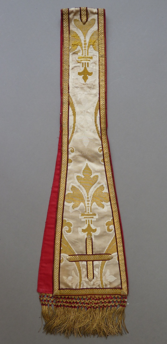 Witte manipel met goudfranje en ingeweven gouden acanthusbladeren, lelies