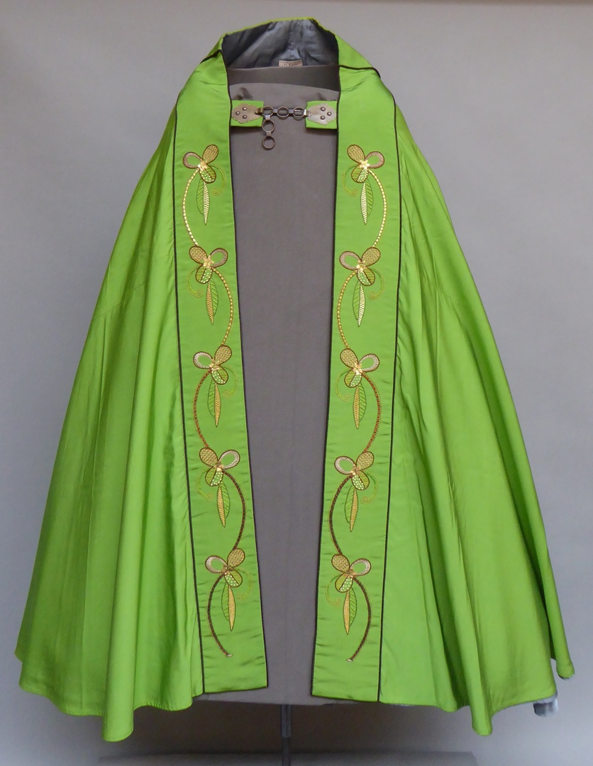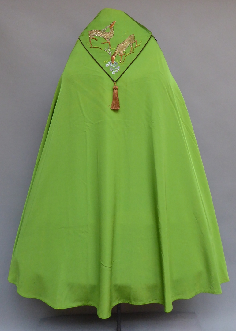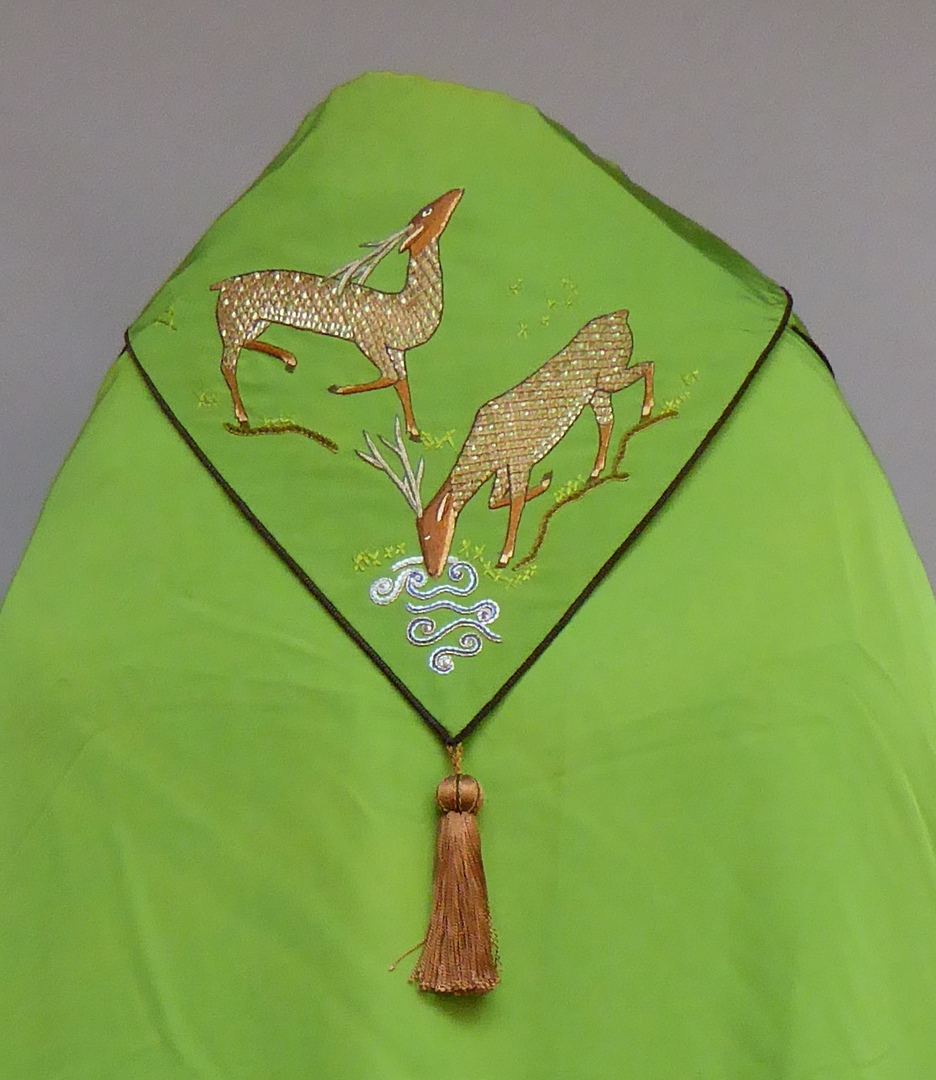 Groene koorkap met schild waarop herten drinkend uit bron