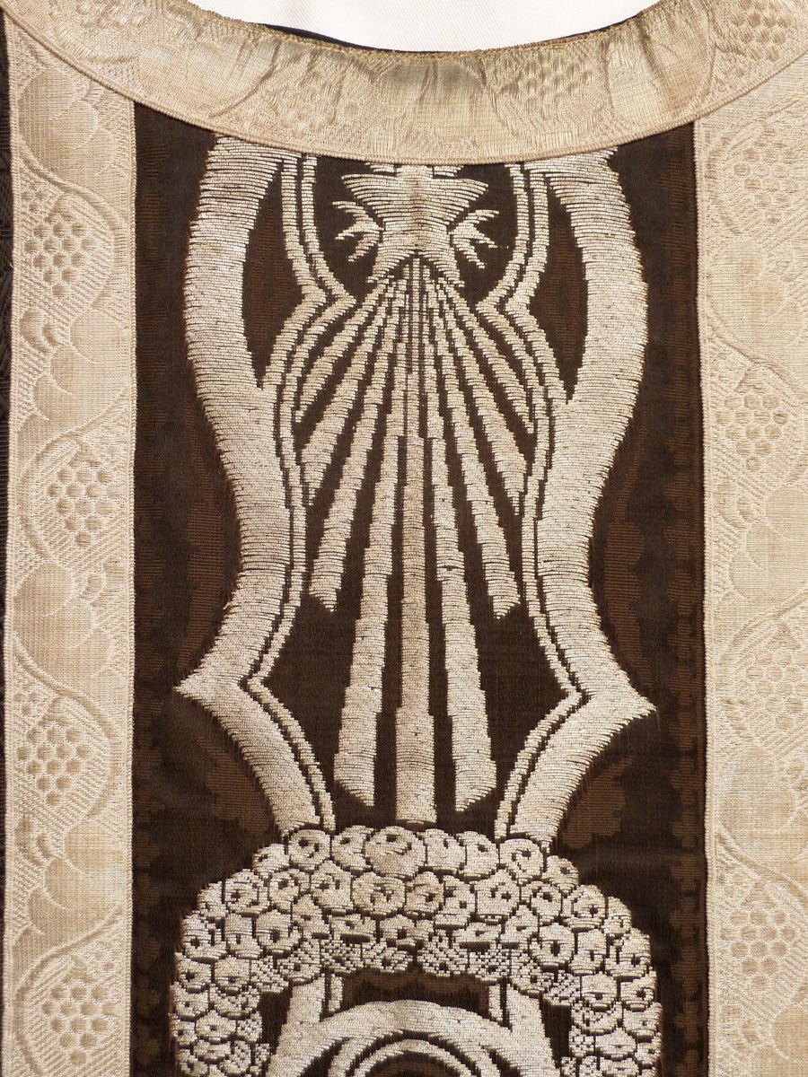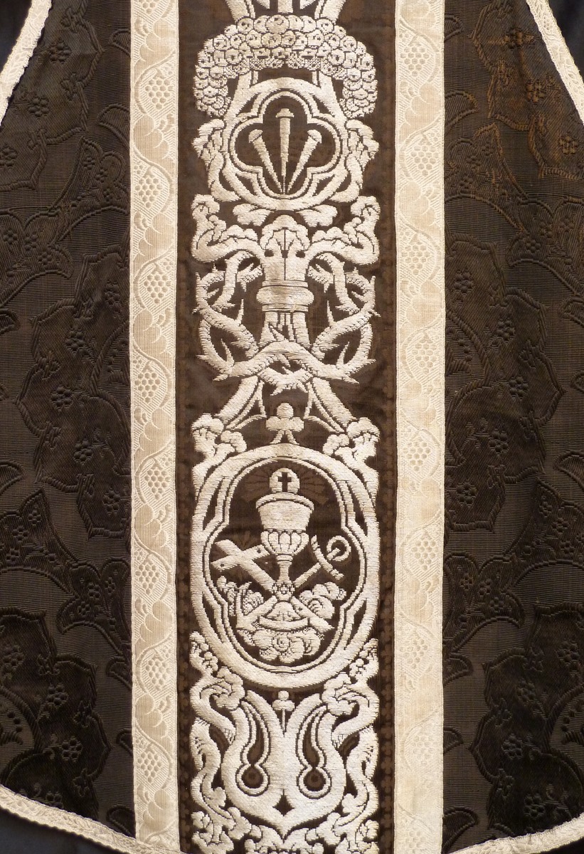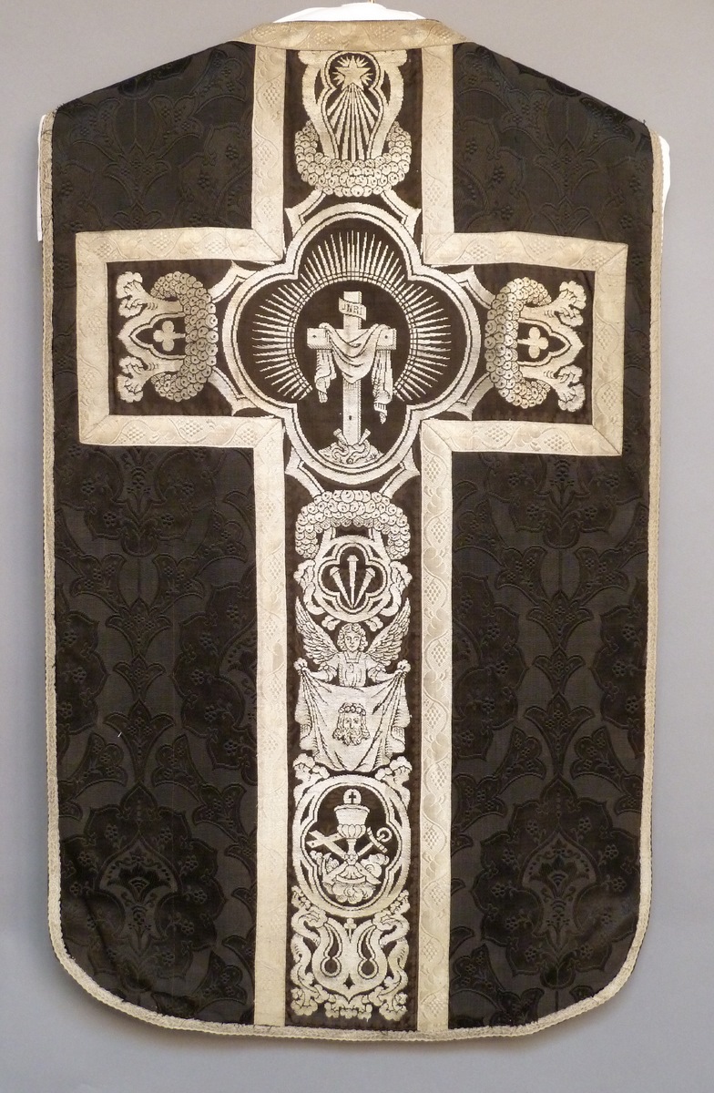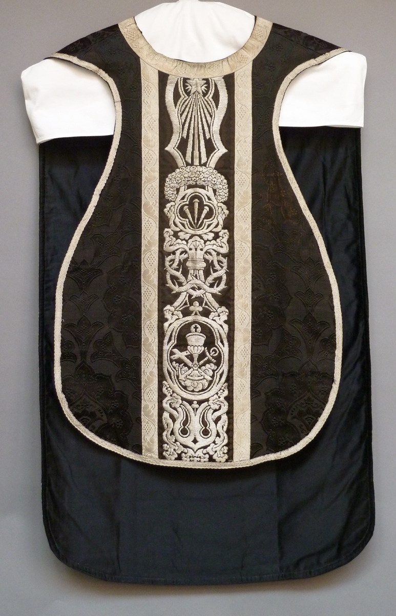 Zwart kazuifel afgezet met geweven zilverband, kruis met I.N.R.I. in vierpas