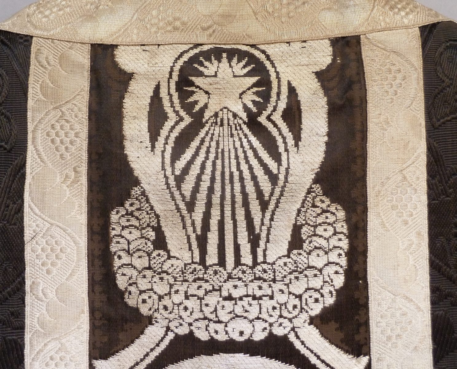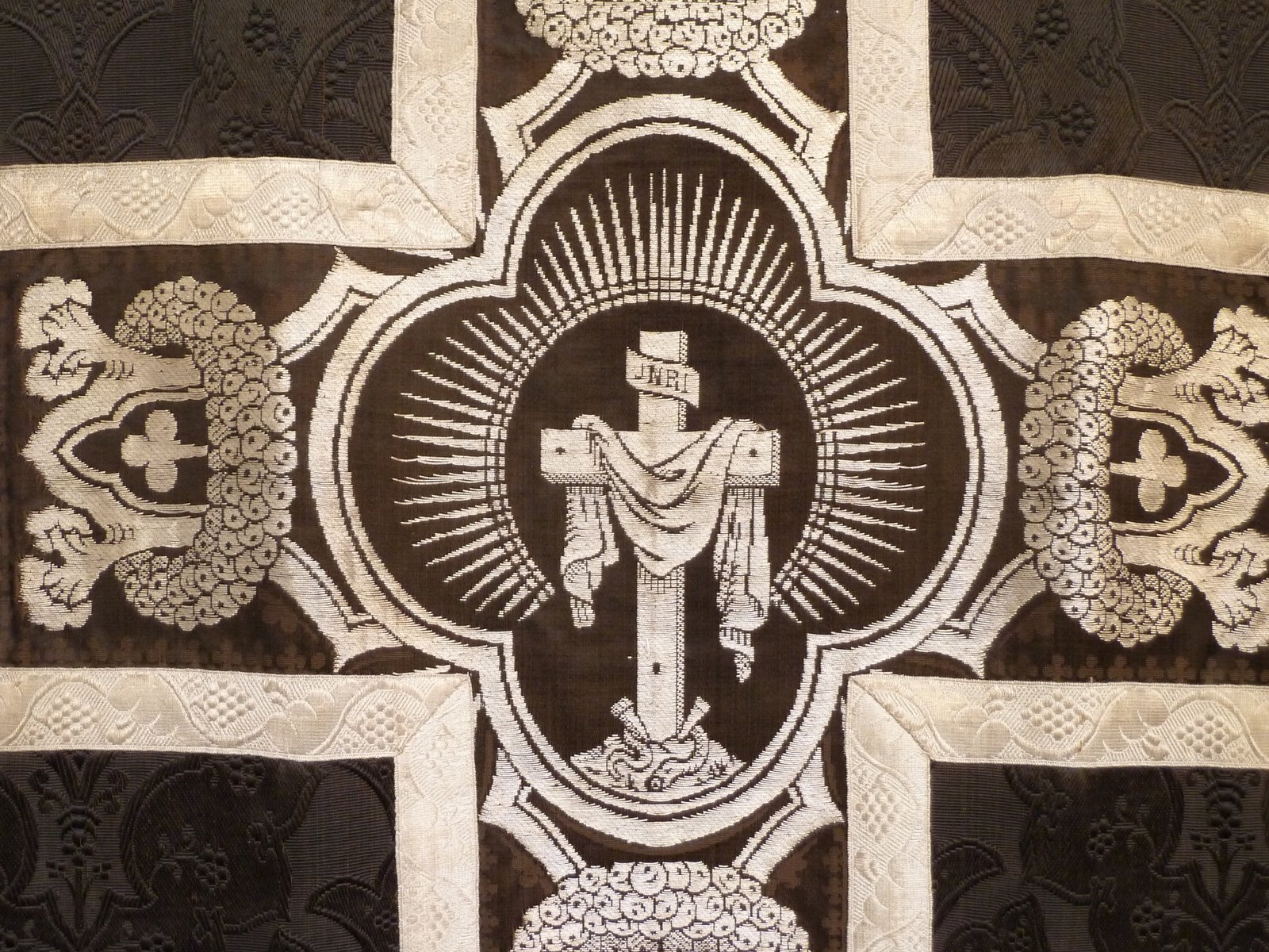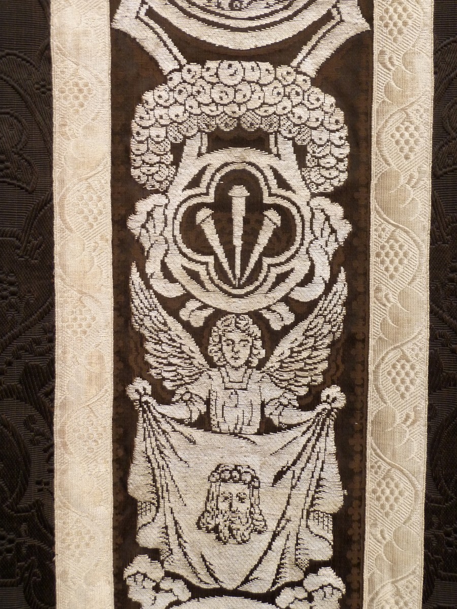 Zwart kazuifel afgezet met geweven zilverband, kruis met I.N.R.I. in vierpas