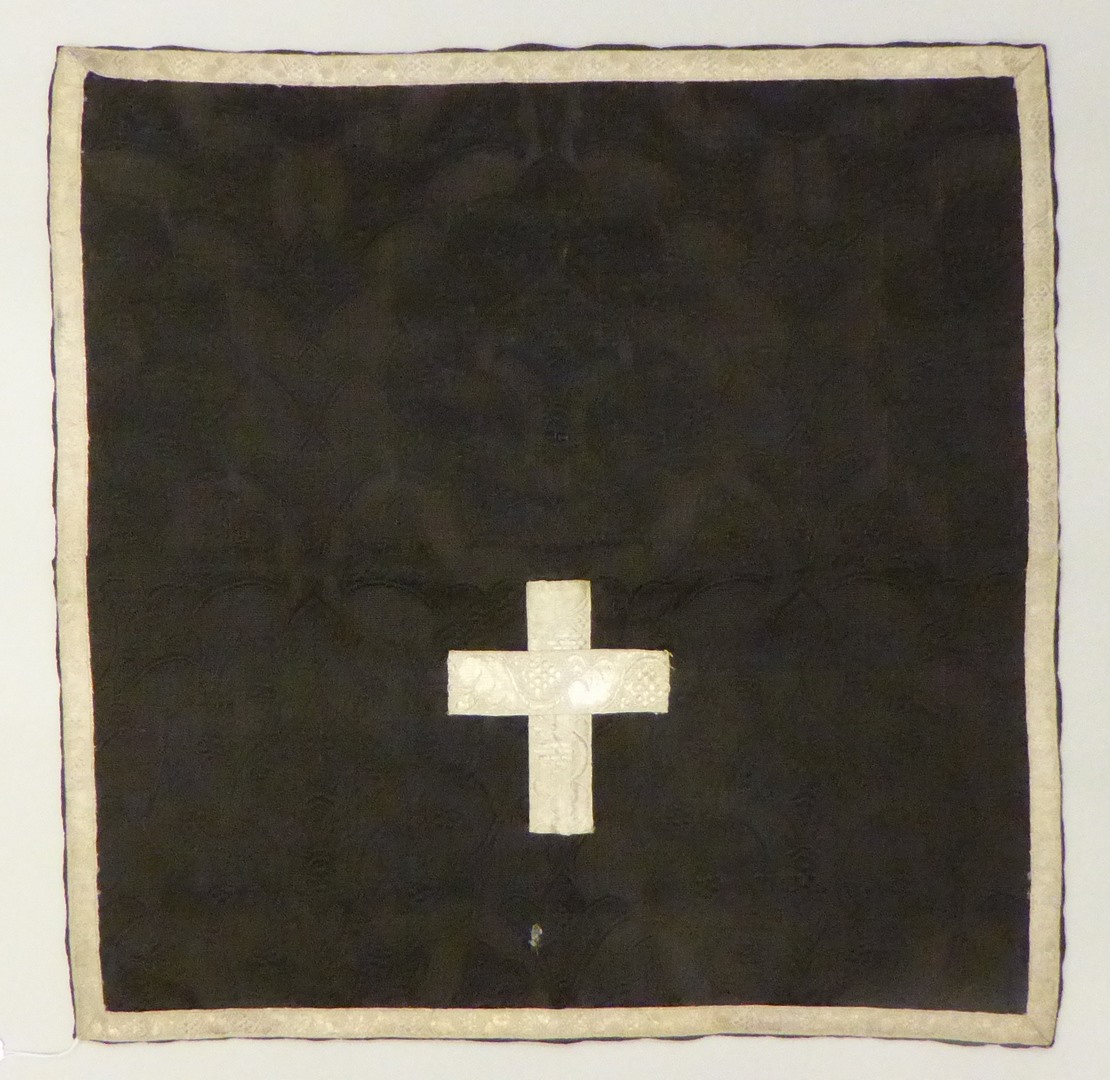 Zwart kelkvelum met ingeweven granaatappelmotief, kruis en rand van zilvergalon