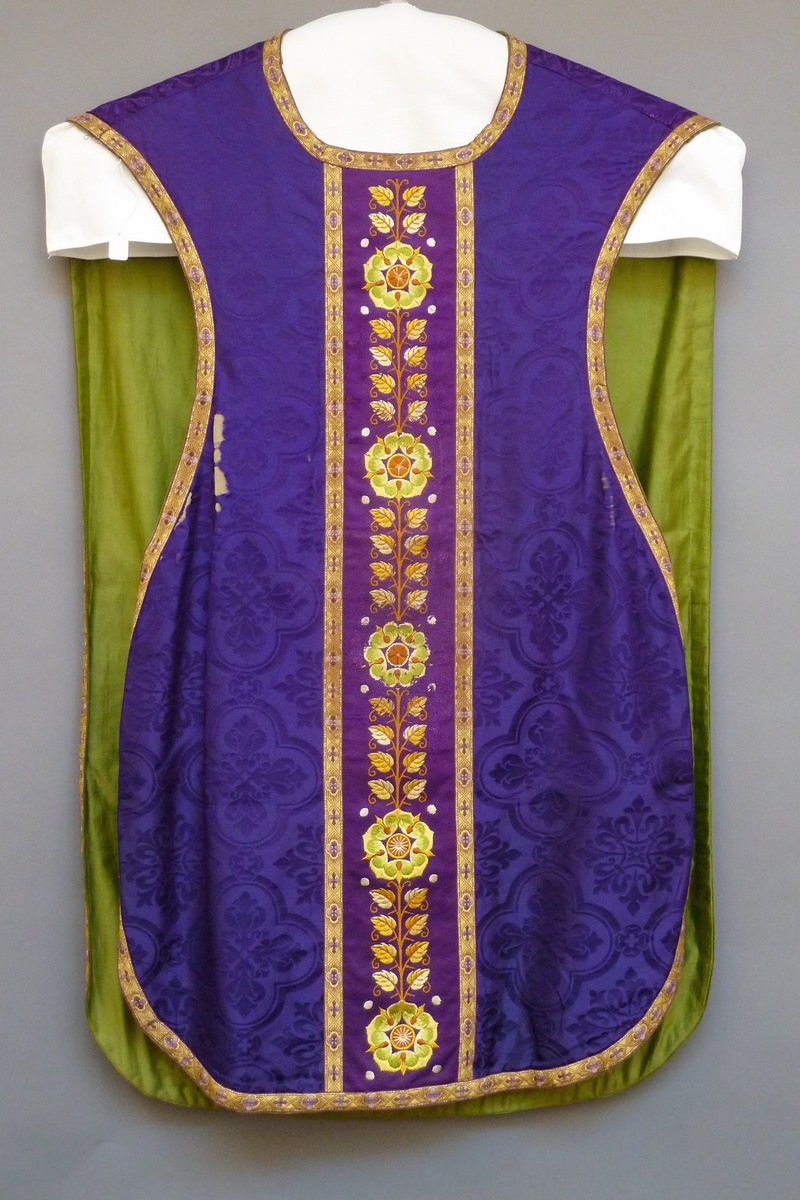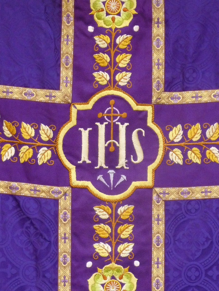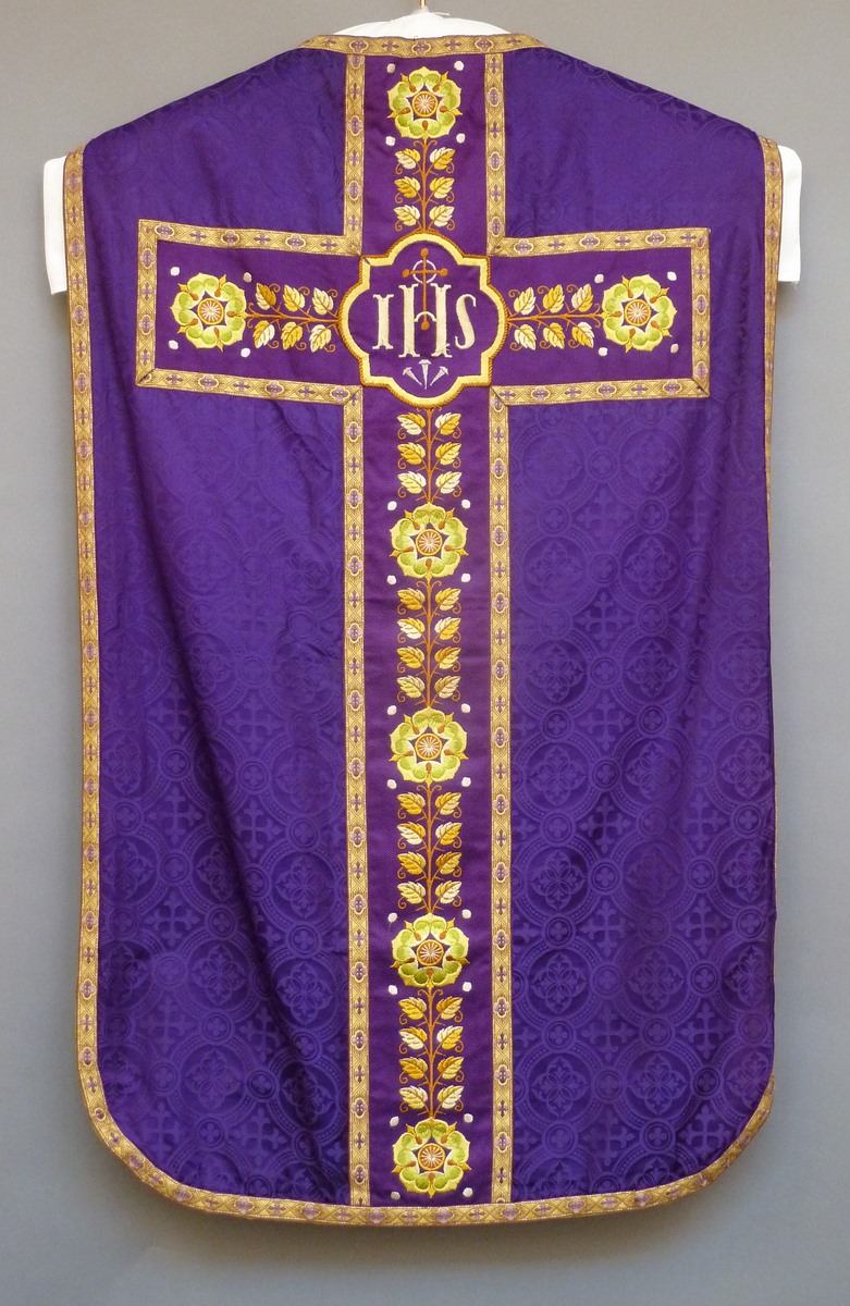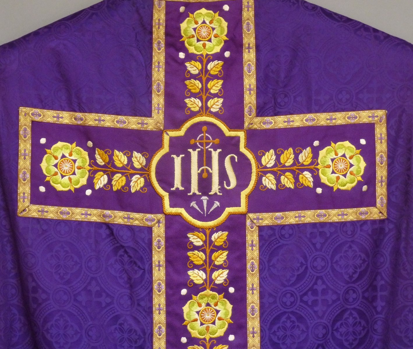 Paars kazuifel met kruis waarin I.H.S. en bloemranken