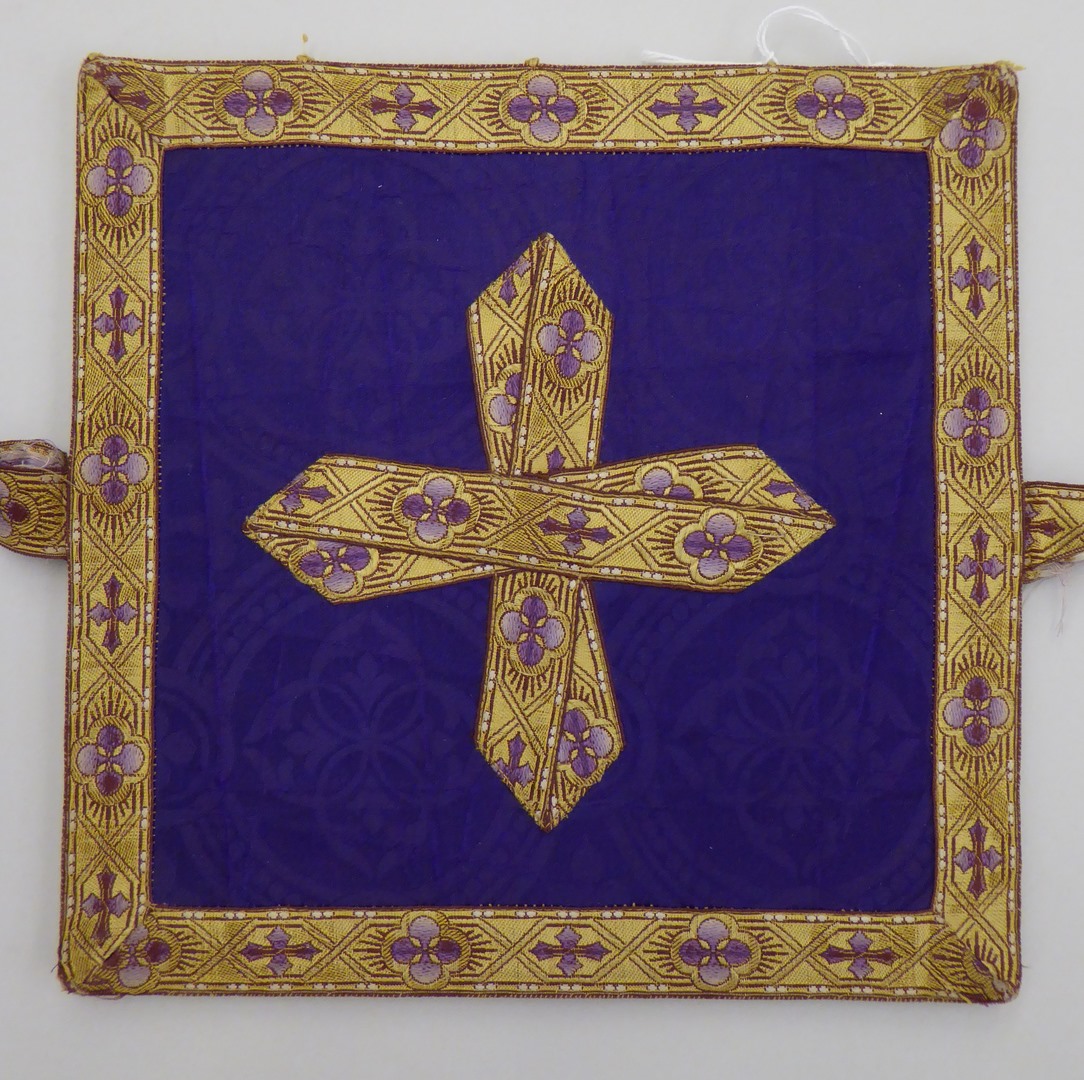 Paarse beurs met ingeweven medaillons, kruisje en rand van geel-paars galonband