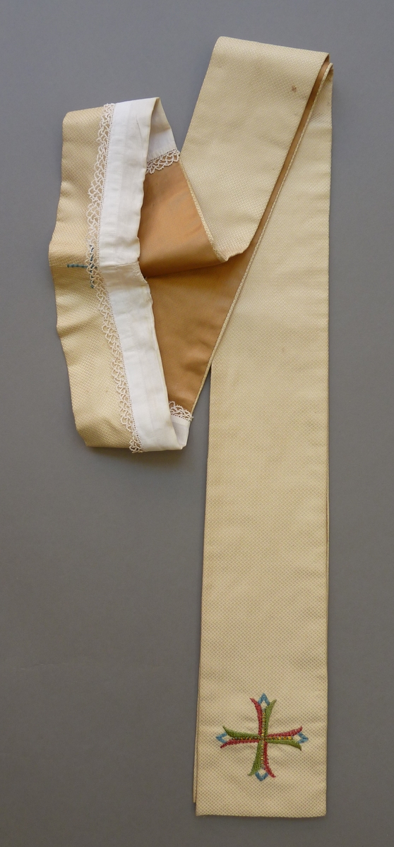 Witte stola geborduurd met roze-groene-blauwe kruisen