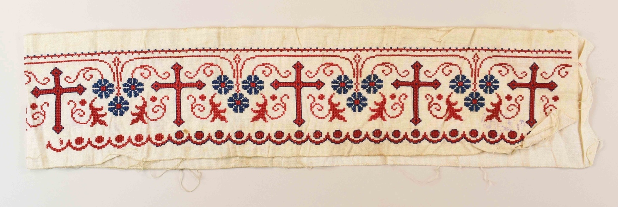 Rand van superplie geborduurd met o.a. blauwe bloemen en rode kruisen, niet voltooid