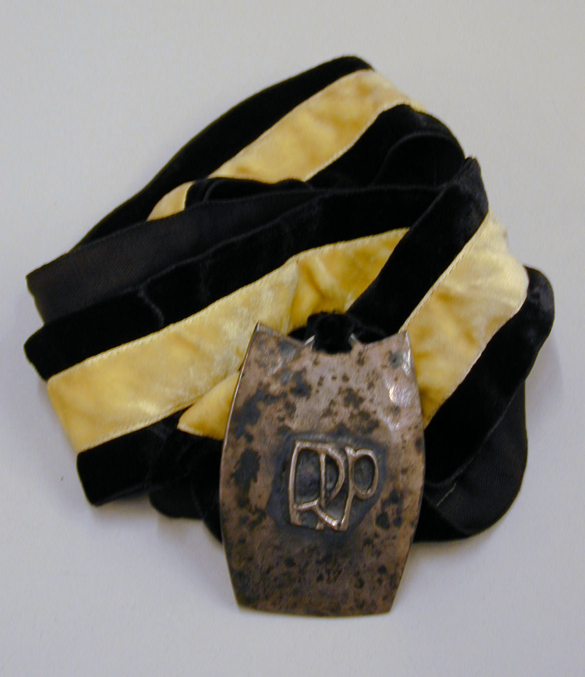 Geel-zwart lint met metalen hanger waarop "R.I.P."