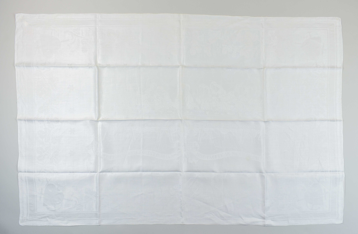 Communiedoek met laatste avondmaal, Geloof, Hoop en Liefde en "Accipite et manducate Hoc est corpus meum Hoc facite in meam commemorationem"