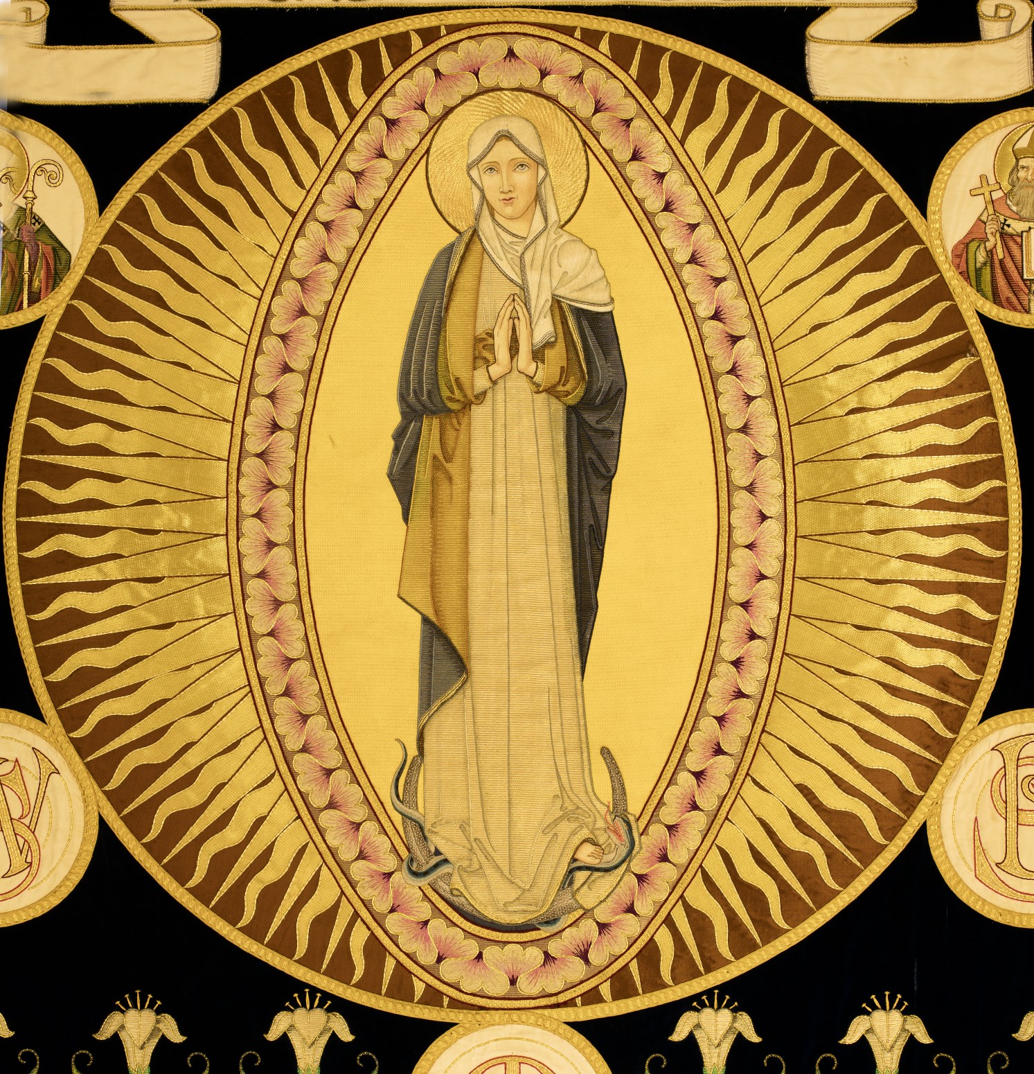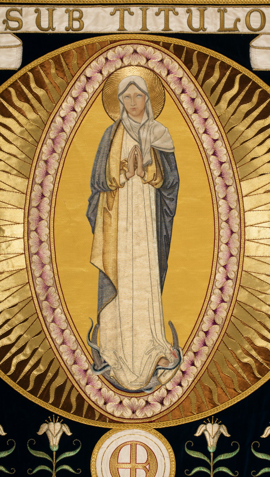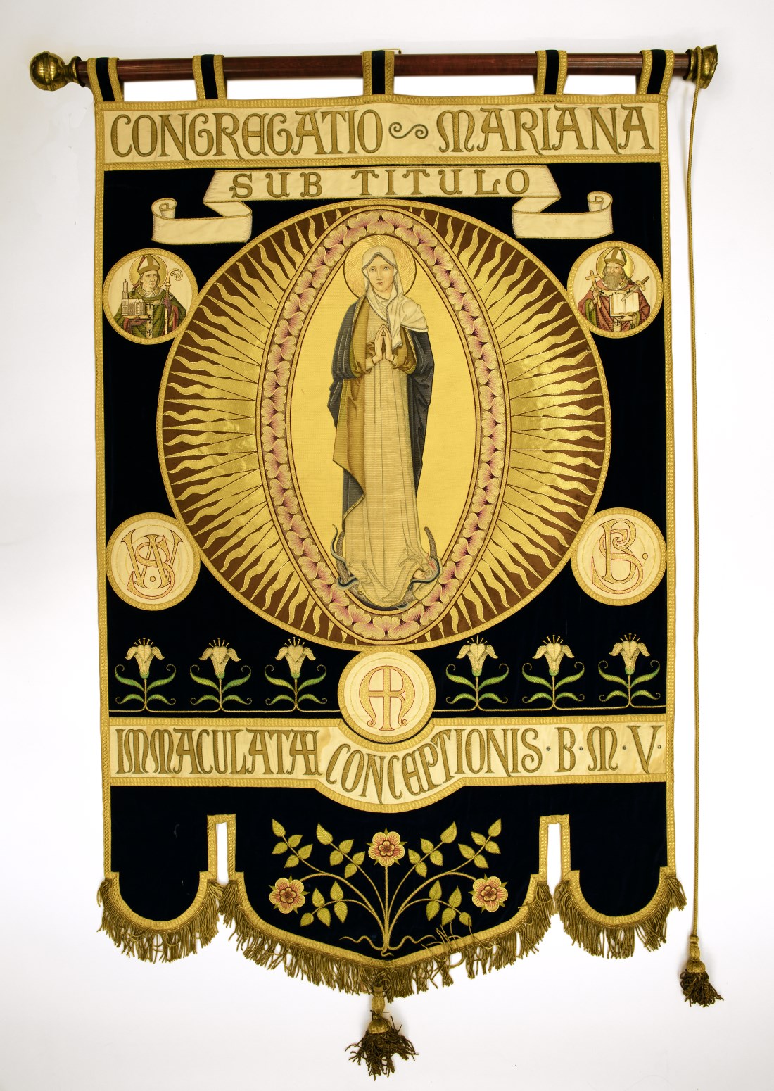 Blauw vaandel van een congregatie Maria Onbevlekt Ontvangen(?) met Maria op maansikkel in stralenkrans, met Willibrord en Bonifatius en met "Congregatio Mariana ..."