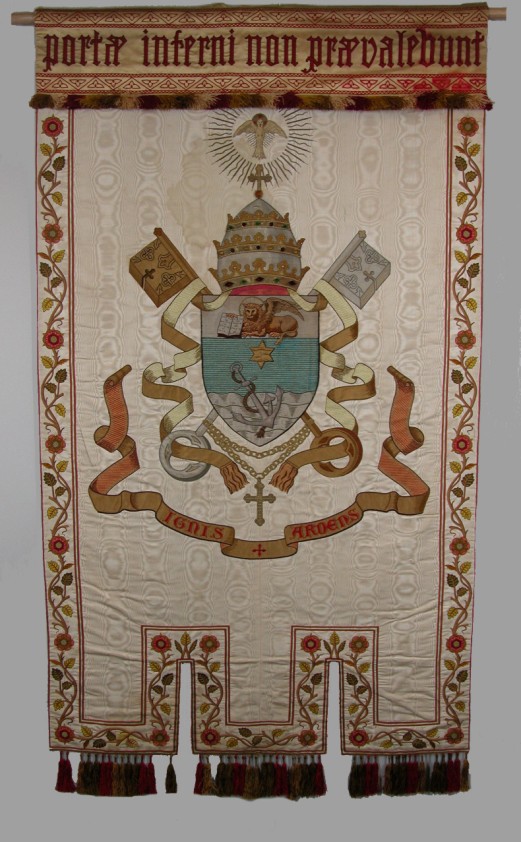 Wit (crème) pausvaandel met tiara en sleutels, Marcus, met "Porti inferni non prevalebunt"