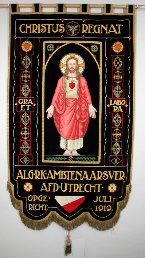 Blauw vaandel met Christus met brandend hart met "Alg. R.K. ambtenaarsver. Utrecht"