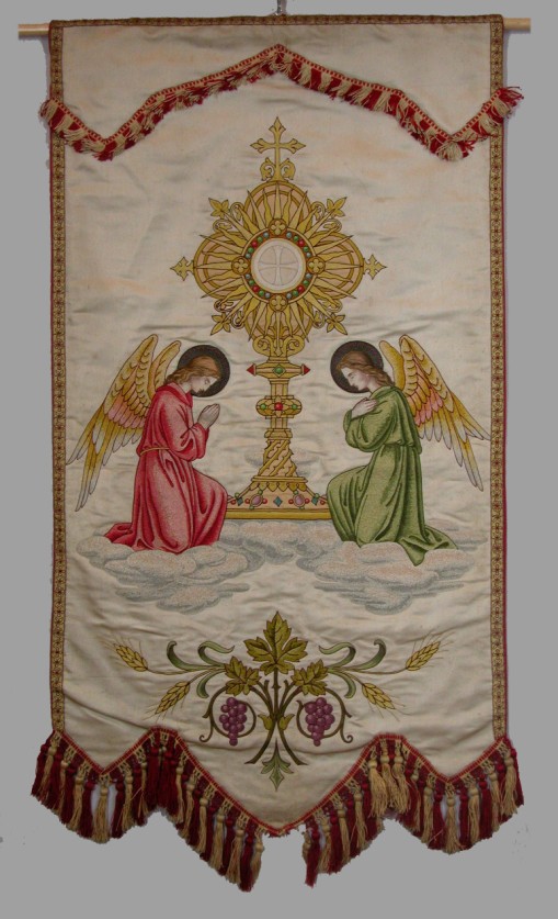 Wit sacramentsvaan met monstrans, geflankeerd door knielende engelen